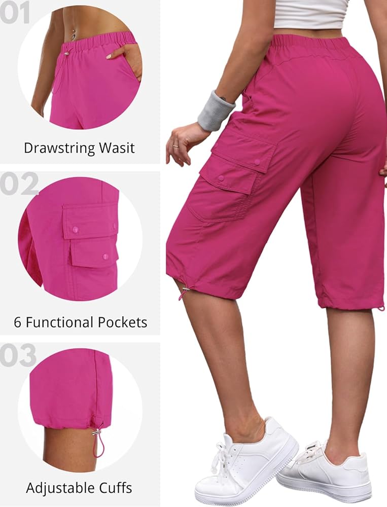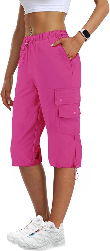 6 Pockets Pull On Capris for Women : Our women capri pants for summer feature with 6 functional cargo pants women pockets, deep enough for keys / cards / phone, all pockets are shut easily with snappy buttons; ladies cargo shorts with elastic waist and loose fitting guarantee free movement during outdoor hike; plus, the womens capris with pockets designed with an adjustable cord around the cuff.