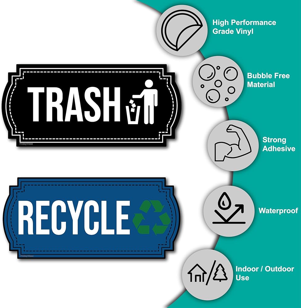 Premium Metallic Vinyl Stickers: A set of meticulously crafted recycling and trash bin stickers, made from high-quality metallic vinyl for an upscale look and durable performance. Each sticker comes with split-back for easy peel and stick.