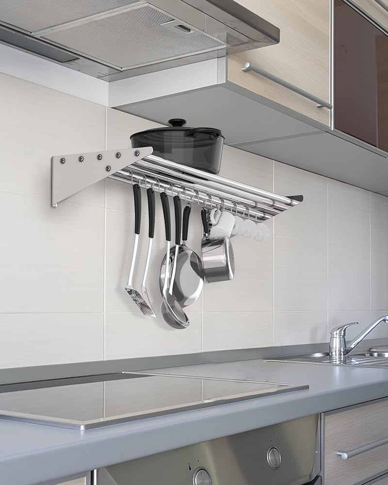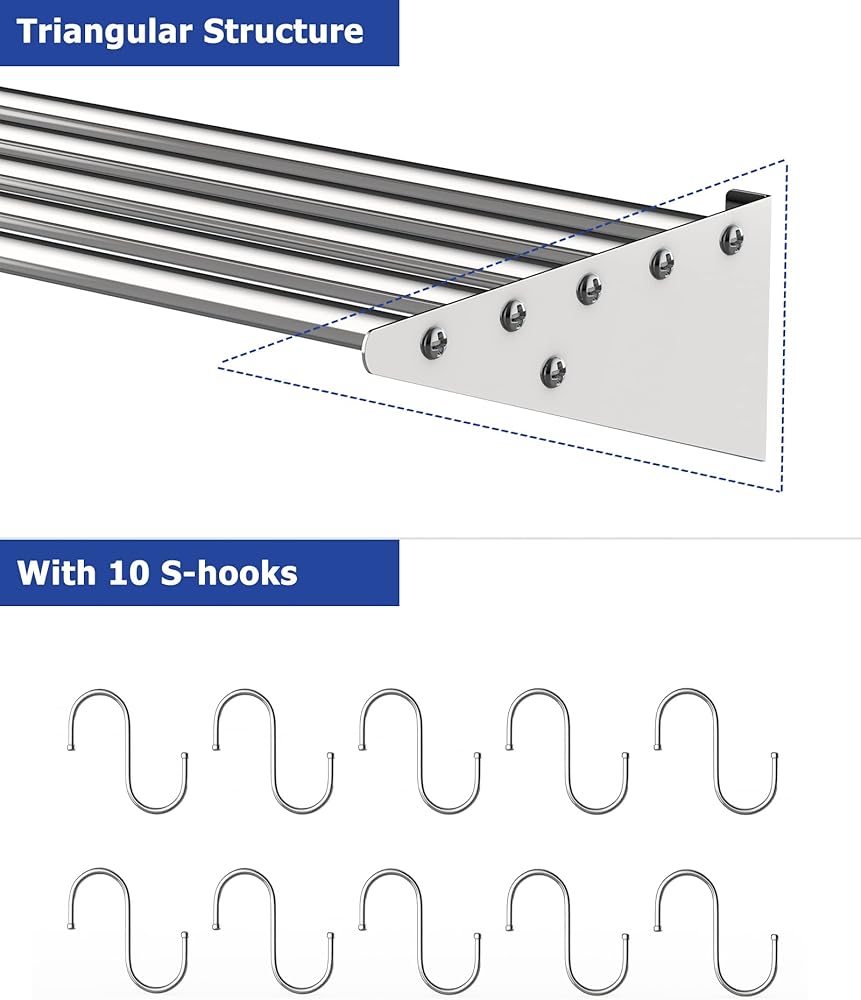 Metal Kitchen Rack for Storage and Organization, [NSF Certified] 12" x 24" Stainless Steel Wall Mount Shelf with 10 S Hooks for Hanging Pots, Pans, Cookware in Home and Restaurant