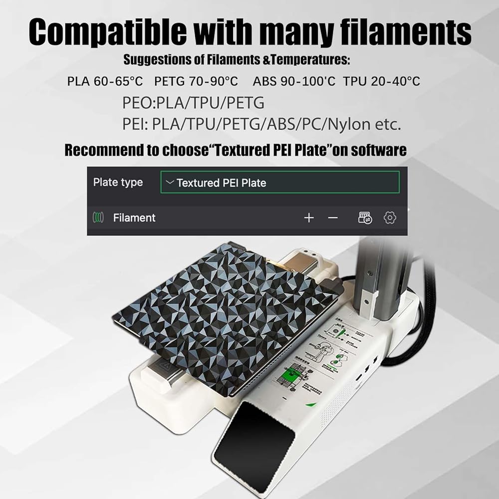 【High Temperature Resistanceand Compatible Filaments】The bambu build plate print bed surface is resistant to high temperature 200°C .After our extensive testing, we recommend Flake and Galaxy build plate to print PLA / TPU /PETG/ABS,If you want to print other filaments, please adjust the parameters.Highly suggested turn off "Enable detection of build plate position" if your pritner is Bambu lab X1/X1C/X1E.