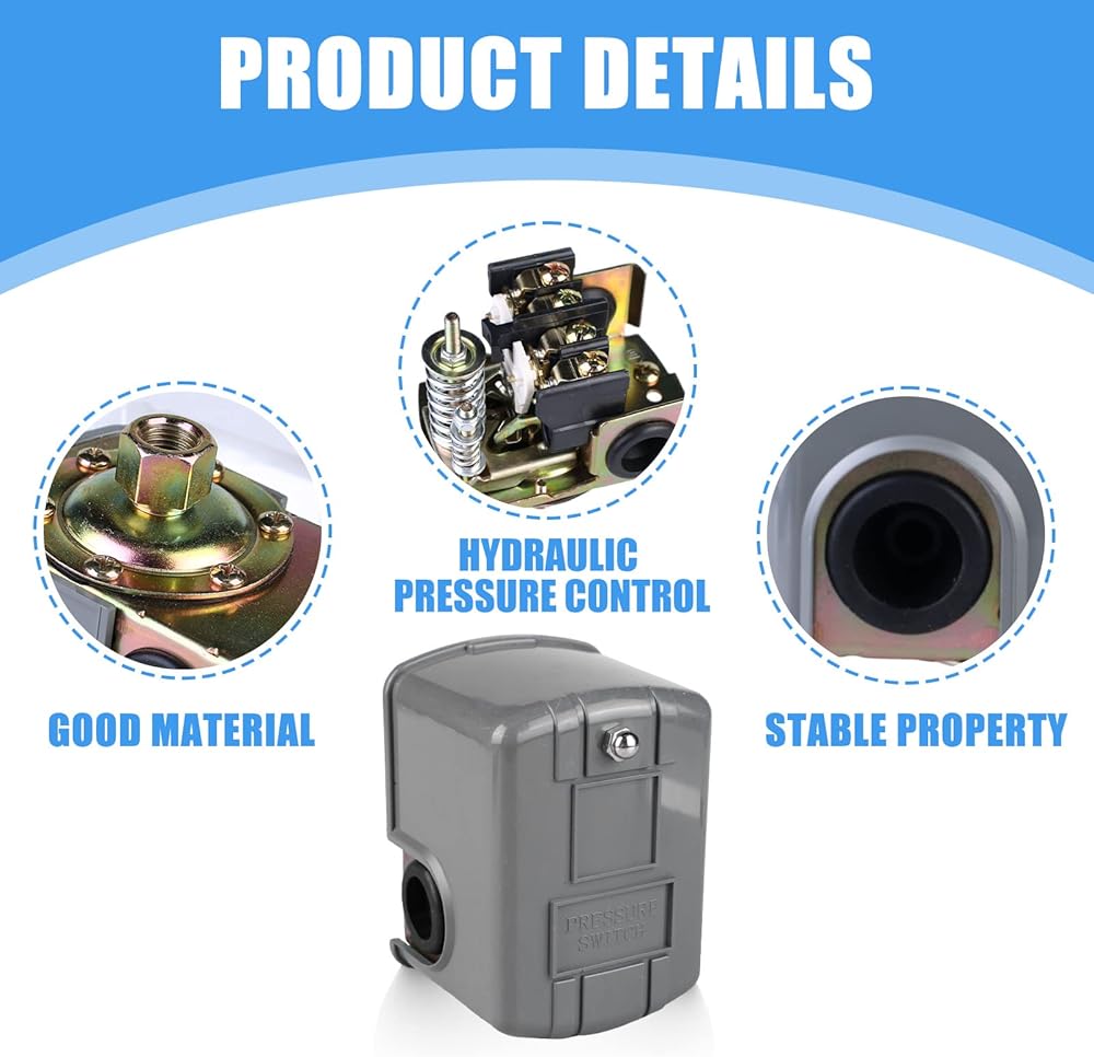 • 🔧【HIGH-QUALITY MATERIAL】 The pressure switch for well pump is made of high-quality materials, which are more corrosion-resistant, strong, and durable. The large contacts of the well pressure switch extend the life of the switch by opening when the pressure rises.