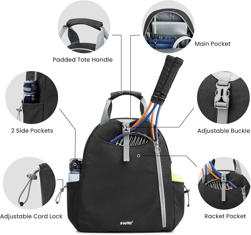 【Large Capacity Tennis Bag】G4Free Tennis Bags have 3 Main Compartments in all. The foremost compartment dedicated tennis racket pocket . The middle compartment with 3 pockets and a key chain ,to organize laptop, iPad, books, tennis balls, sports sweatshirt clothes, towel, etc.Both side pockets can be used to hold water bottles or umbrellas
