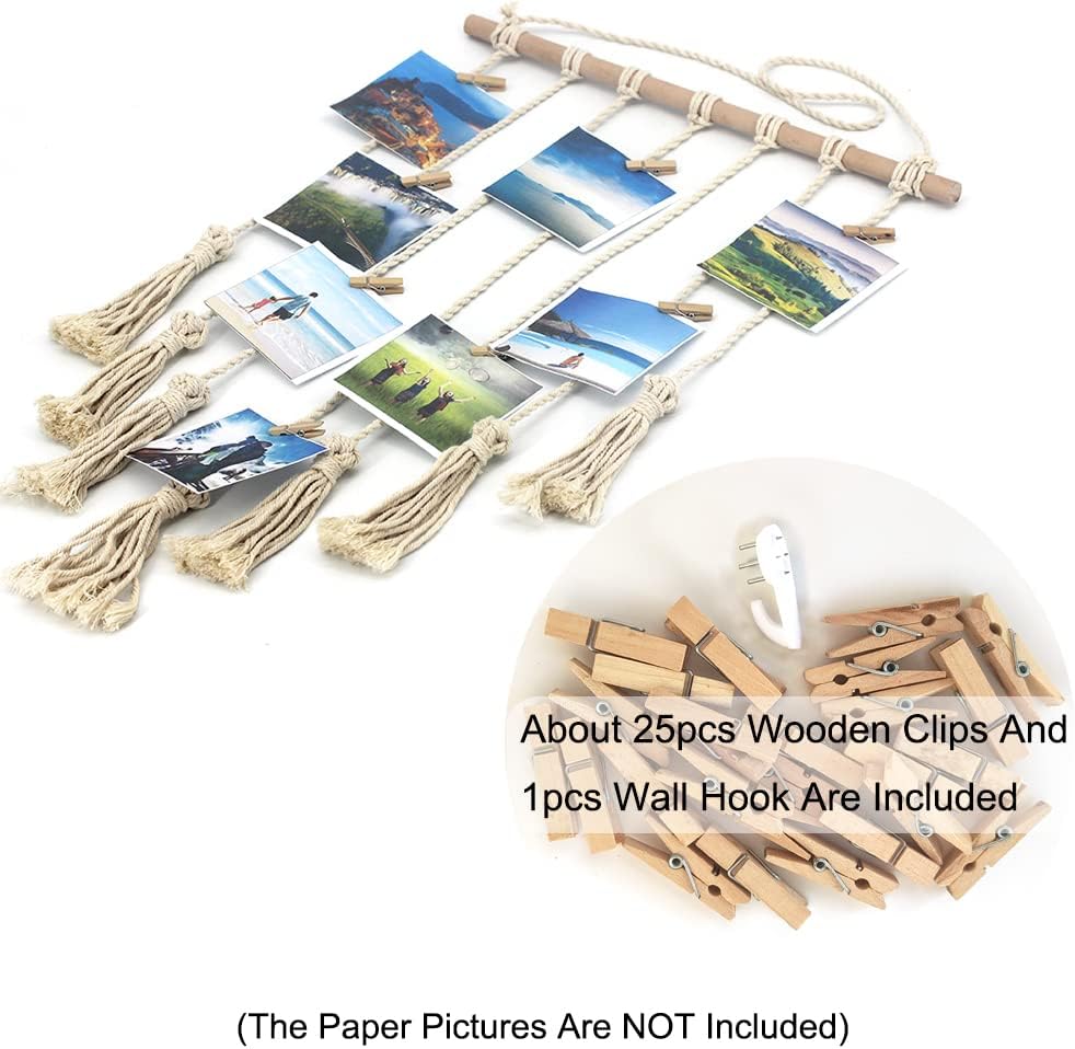 Nice Wall Decor: Macrame hanging organizer not only can show your favorite photos and prints, but also can be a independent wall decor by attaching some other small beautiful decoration objects (using the wood clips, around 25pcs).