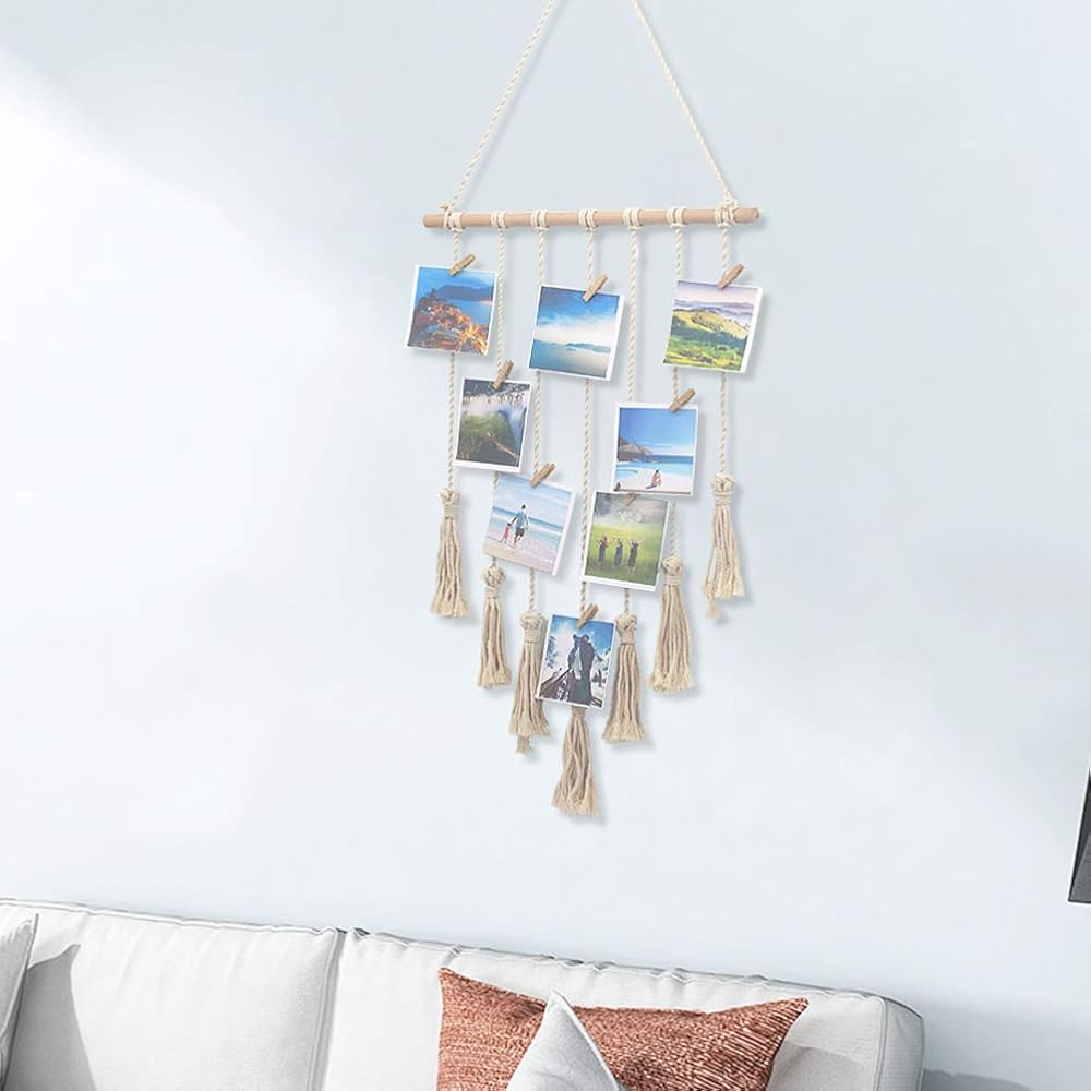 Photo Display: Macrame wall decor photo display is a artistic way to show your favorite photos and prints. This boho photo organizer creates a great way for people to mark their wonderful moment of life, showing happy memories.