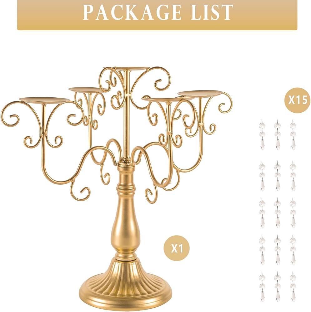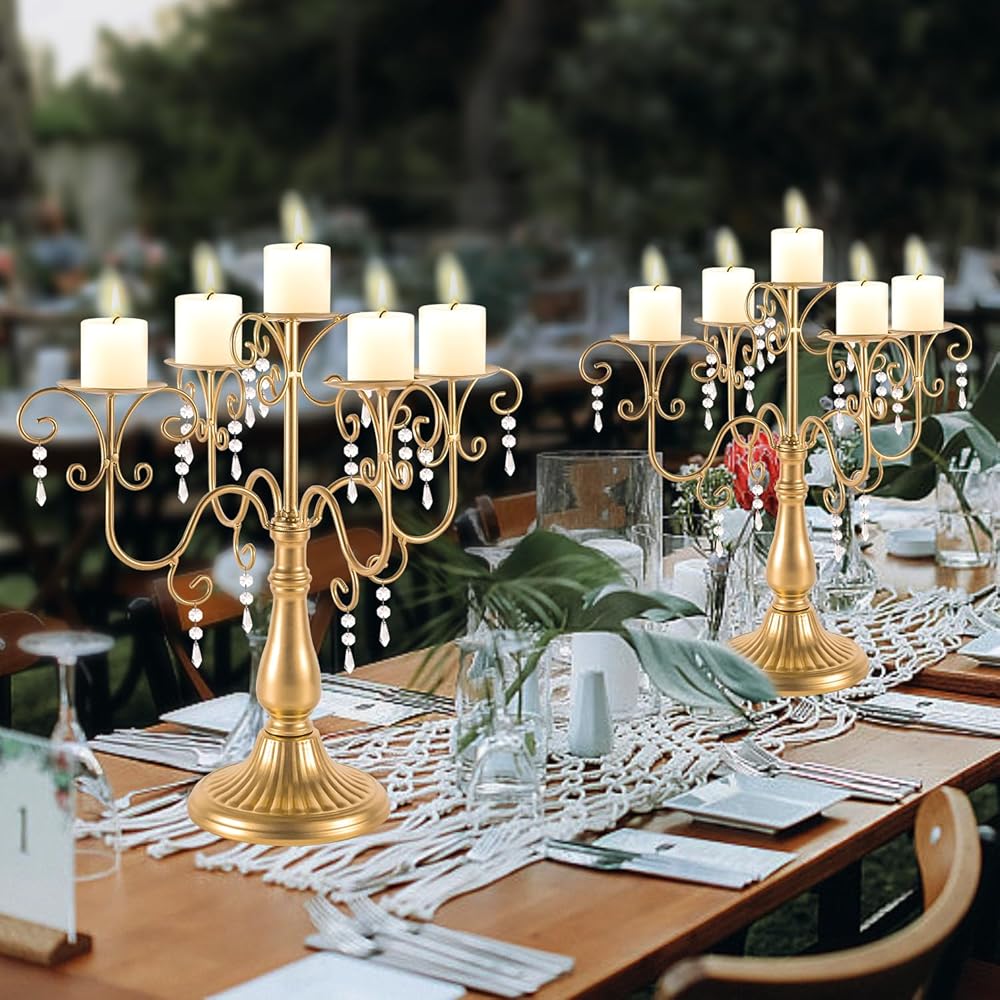 Elegant Design: White retro candelabra centerpieces for 5 pillar candle holder, delicately designed curved scroll-branch and classic pedestal, shiny white finish, decorated with acrylic pendant, perfectly combine simplicity with opulence, add vintage, elegant and romantic vibe.