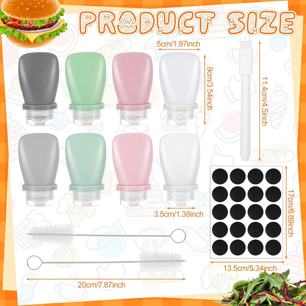 8 Pcs Mini Salad Dressing Bottles: You will get 8 leakproof mini squeeze bottles for sauces, 38ml/1.3oz each, in 8 different colors, including black, green, gray green, gray, pink, light pink, white and transparent. You will also get 1 erasable marker pen , 20 shape labels and 2 cleaning brush.They are perfect for storing salad dressings, ketchup, honey, mustard, BBQ sauce, soy sauce, vinegar, oil, and more.