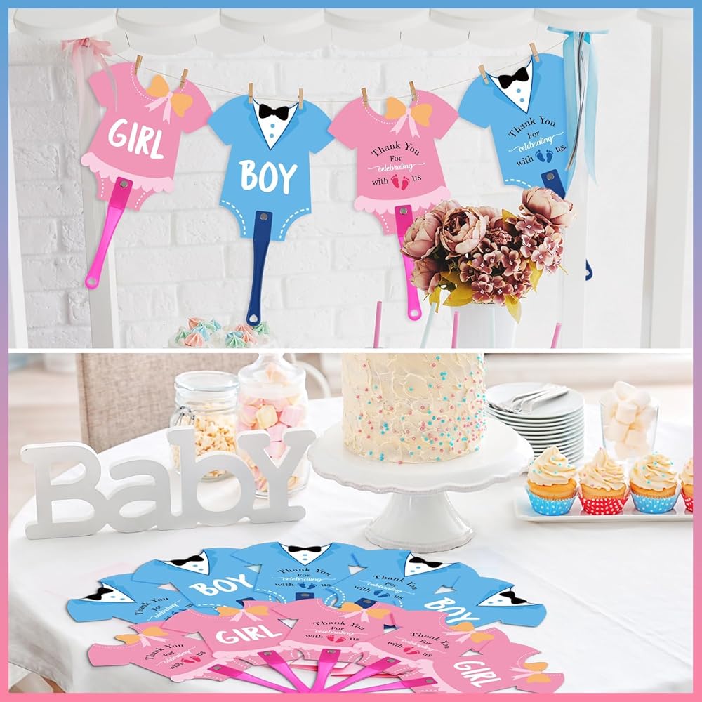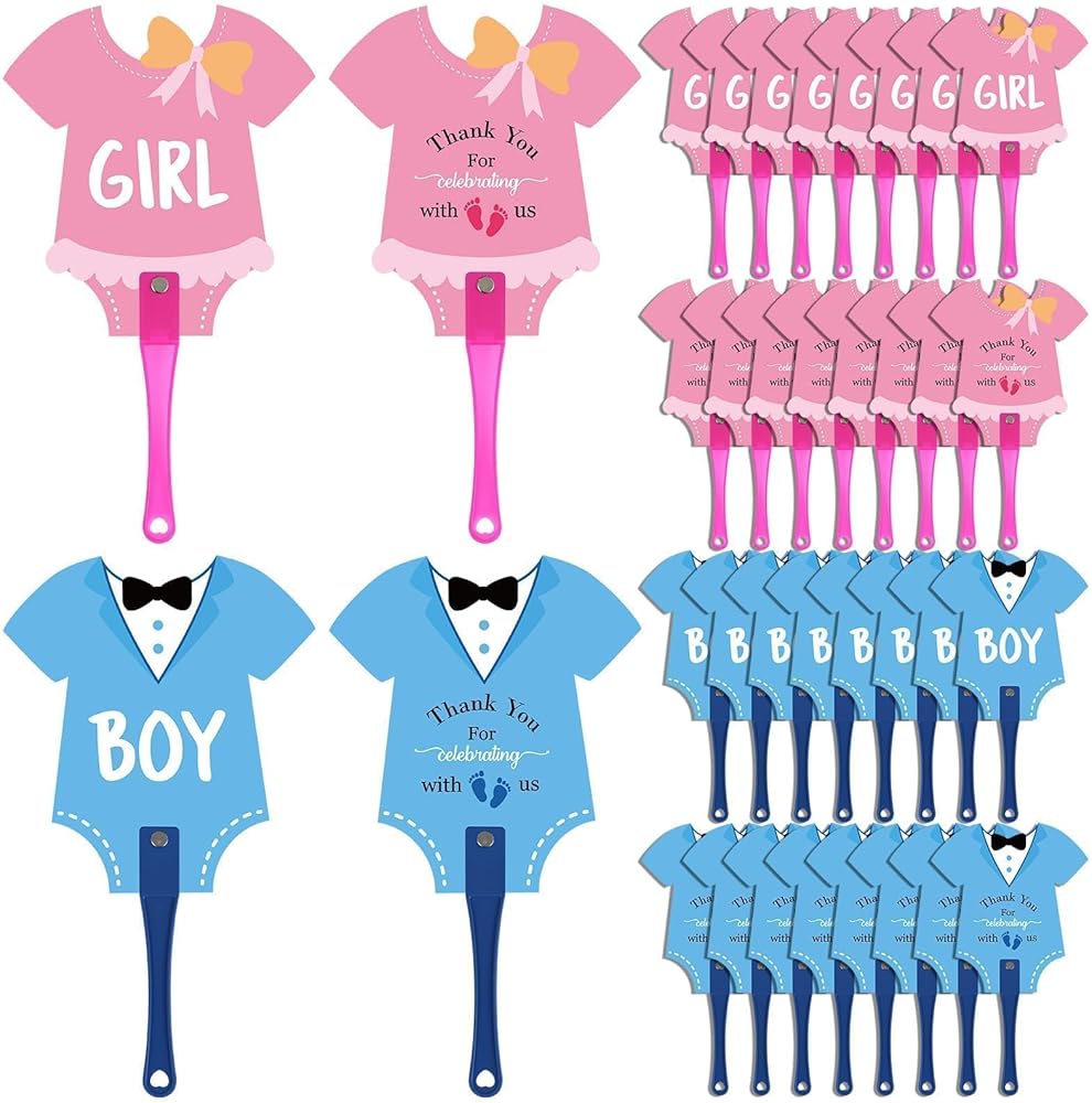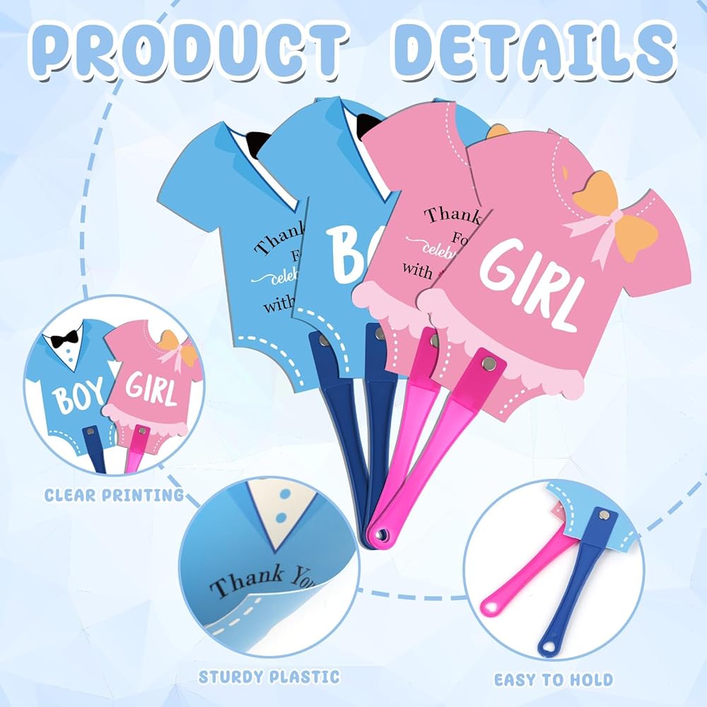 Baby Shower Hand Fans: These plastic hand fans are designed with two adorable baby clothes motifs, the front and back have different patterns, the front has ‘girl' and ‘boy', and the back is printed with ‘Thank you for celebrating with us! ‘Thank you for celebrating with us' on the front and ‘Thank you for celebrating with us' on the back, easy to bring joy and fun to your party, a great gift for baby shower guests!