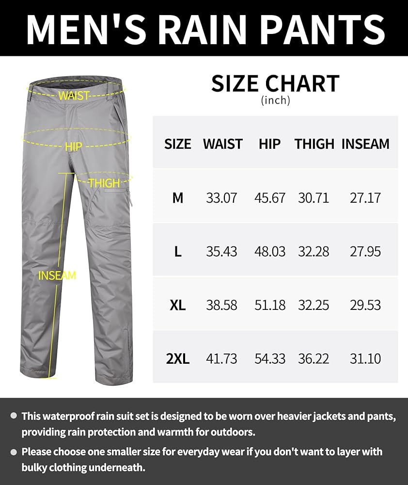 【Size Suggestion】According to our size chart, this waterproof rain pants is designed to be worn over heavier pants, providing rain protection and warmth for outdoors,like fishing,climbing,camping,golf,bicycle,hunting.