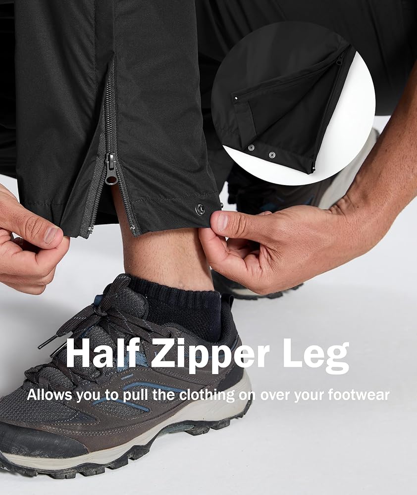Adjustable Leg Design: mens golf rain pants updates foot openings, it can be zipped open or closed to allow a looser fit any boots,even thick hiking boots or winter gear on. Baggy legs provide space for full range of motion during hiking. Also,they have buttons to make the openings tighter to your legs in order to prevent other materials from entering up your leg for outdoor activities.