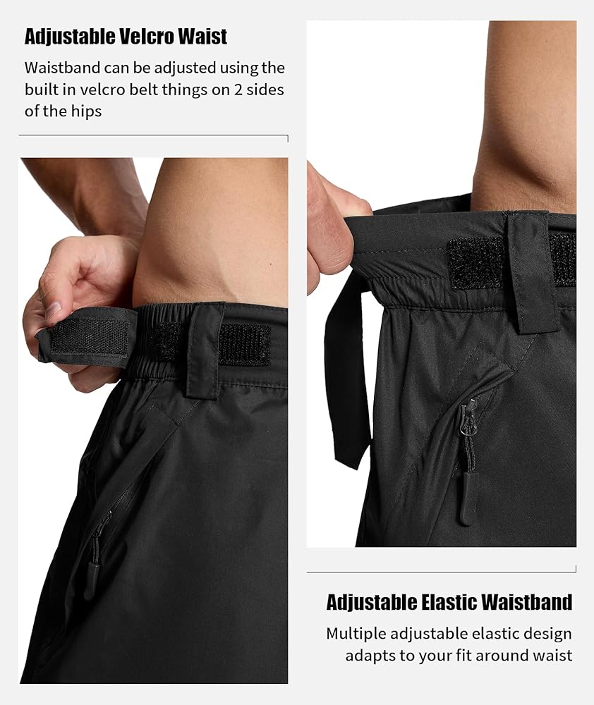 Adjustable Waist Design: mens waterproof rain pants can be adjusted using the built in velcro belt things on both sides of the hips, and the crotch of the rain pants is a combination of zipper and button.