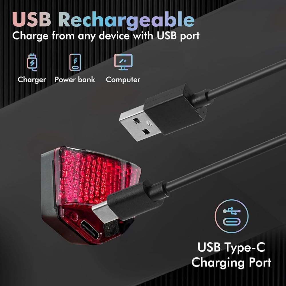 【IPX6 Water Resistant】The rear light is made of IPX5 waterproof material, the USB charging port is also made of the silicone material can well protect the interior of the light.