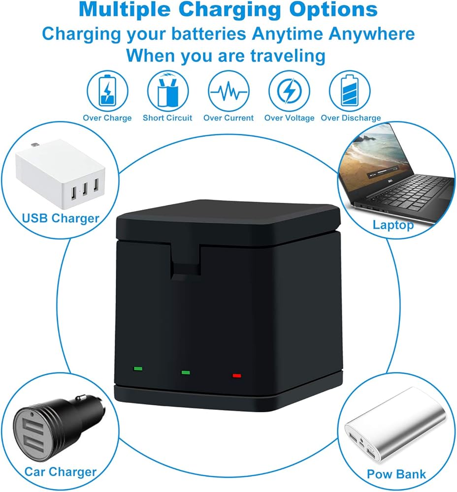 【Simultaneous Charging & Storage Box Design】Charge 3 GoPro Hero8 batteries simultaneously or individually and LCD display charging status of each battery. GoPro Hero8 battery charger is not just a charger but also a good storage box for Hero8 batteries when you are traveling.
