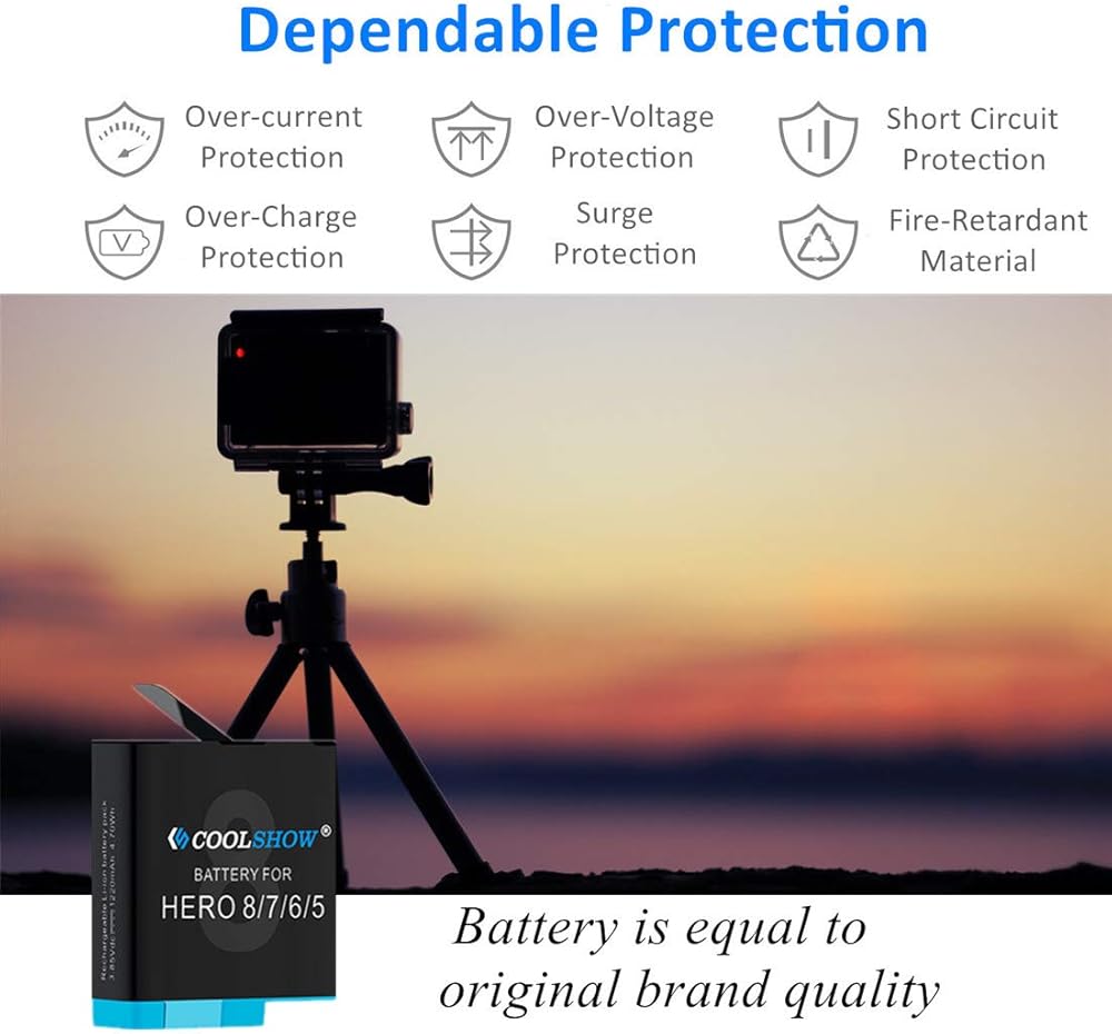 [3 Real Capacity Backup Batteries] Each GoPro HERO8 battery is rated at 3.85V, 1220mAh ,4.7 Wh with high capacity to keep your GoPro Hero 8/7/6/5 camera running 720p /240fps about 130 mins,720p/60fps about 135 mins , 1080p/120fps about 100 mins 1080p/60fps about 110 mins, 1080p/30 fps about 120 mins,4K /30fps about 90 mins depending on your motion settings.