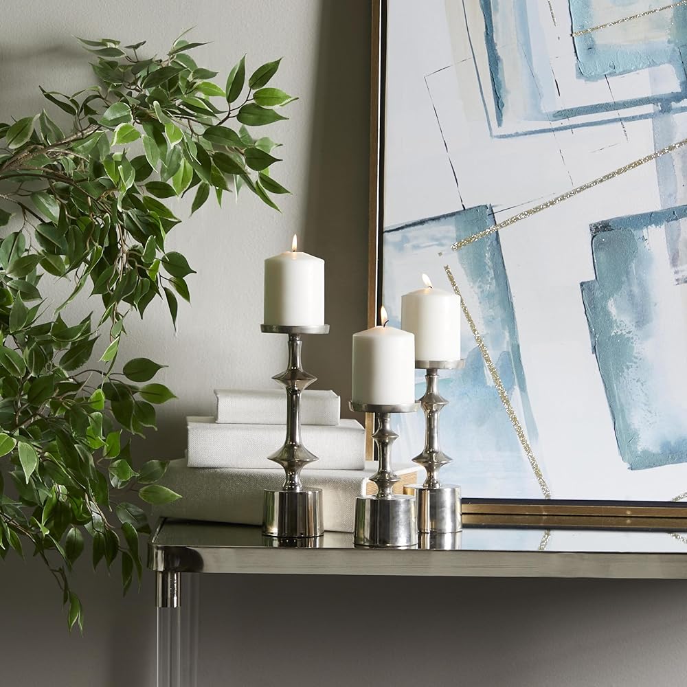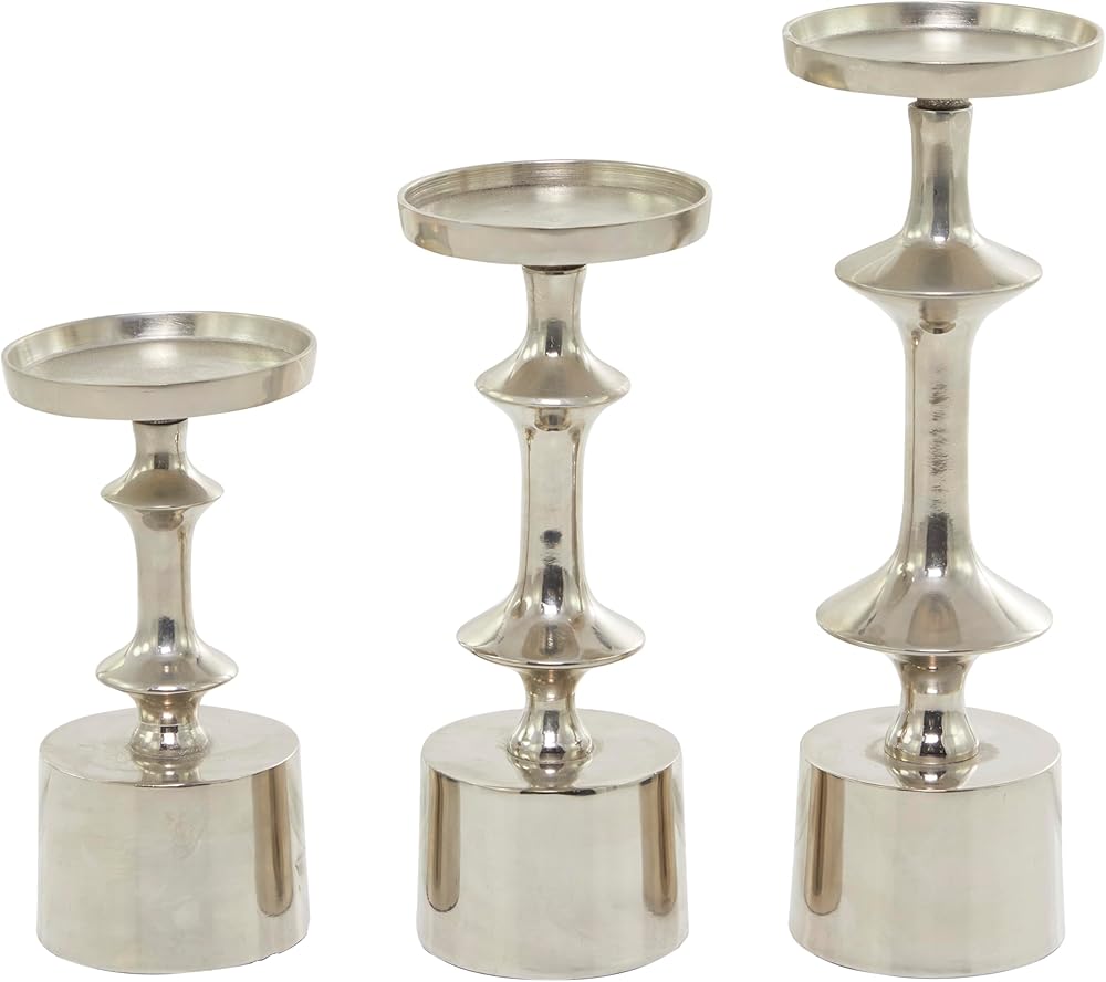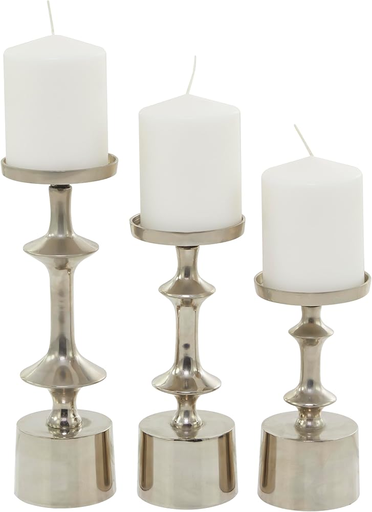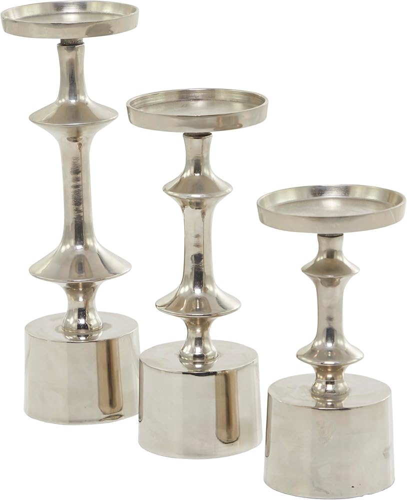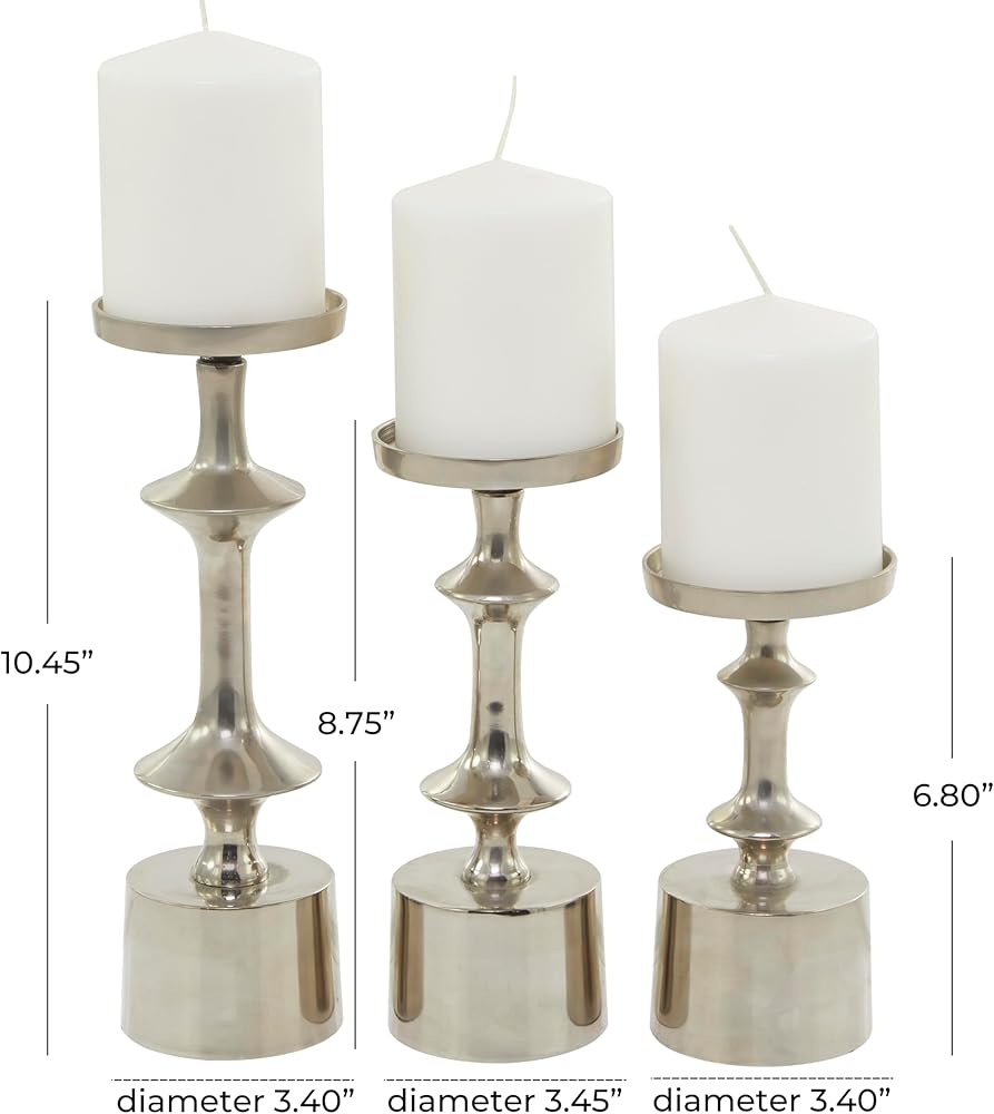 Table top candle holders is crafted of welded aluminum that are intricately carved to create curved structure and glazed with a shiny coating. Decorative candle holder carries round structure with a solid pattern. Wipe clean with a dry cloth. Pillar candle holders can add a touch style and light illumination throughout your home as you paired with scented or LED candles. Designed with felt or rubber stoppers at the base that prevent scratching furniture and table tops, as well as sliding around. Can hold 3 pillar candles, not included. This item ships in 1 carton. Aluminum candle holder makes a great gift for any occasion. Suitable for indoor use only. This item ships fully assembled in one piece. Made in India. This black colored aluminum candle stand comes as a set of 3. Modern style.