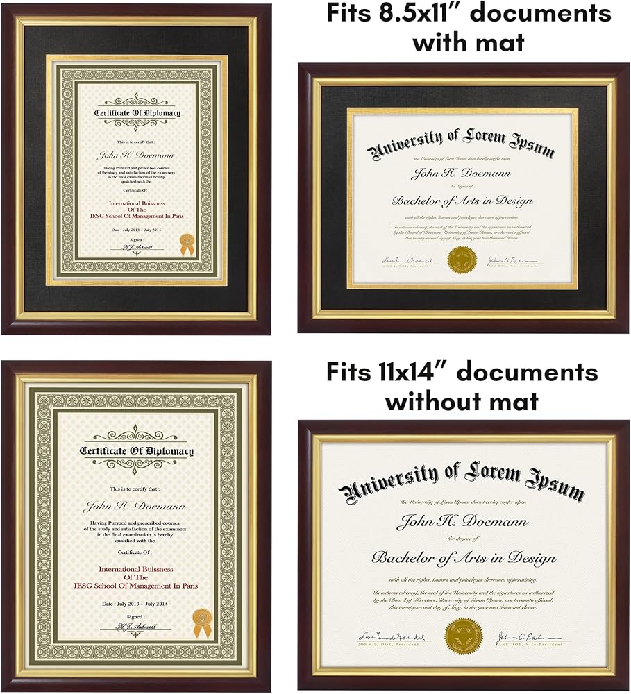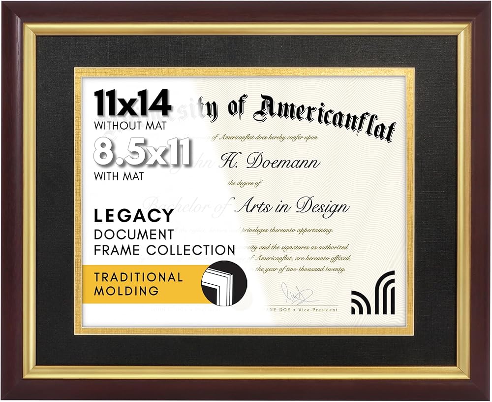 Traditional Style Frame: These 11x14 frames are a great way to frame certificates and documents either for full size 11x14 documents, or smaller 8.5x11 certificates when used with the mat included. Actual mat display area is 8x10.5 inches.