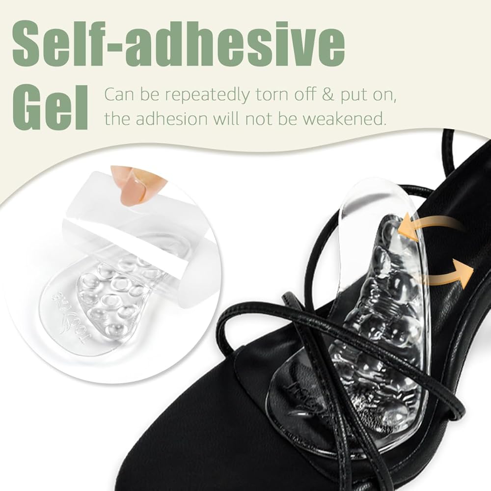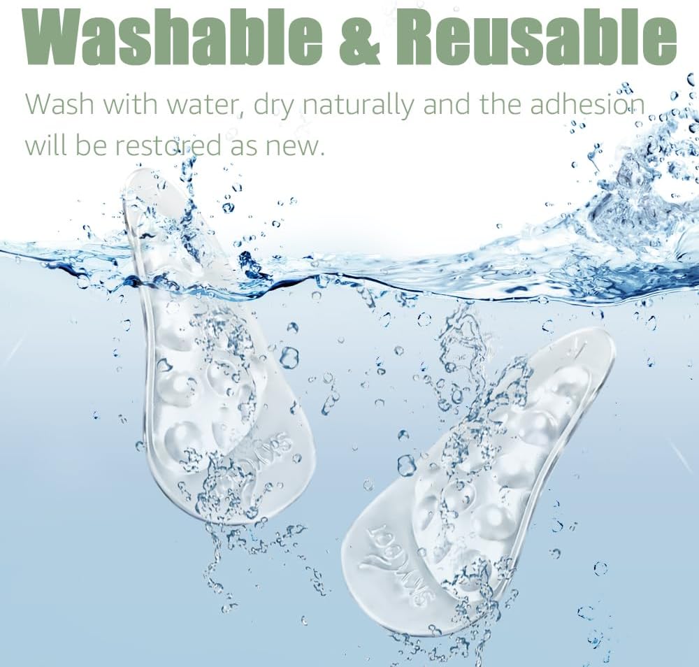 [ Self-adhesive Gel Arch Inserts ] This arch inserts is made of gel with self-adhesive properties, it can be used over and over again, stick on and tear off at will, switch between different shoes without damaging your shoes. If the gel arch insoles sticks to dust, or its stickiness is weakened, you can wash it with water, and after drying it naturally its stickiness will be back as good as new.
