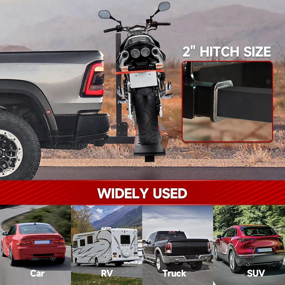 【Compatibility】The carrier can accommodate motorcycles with tire widths up to 5 inches, ensuring it fits most motorcycle models on the market. It is also compatible with standard 2-inch receivers, allowing it to match most vehicles. This broad compatibility makes it an ideal choice for various motorcycle transport needs.
