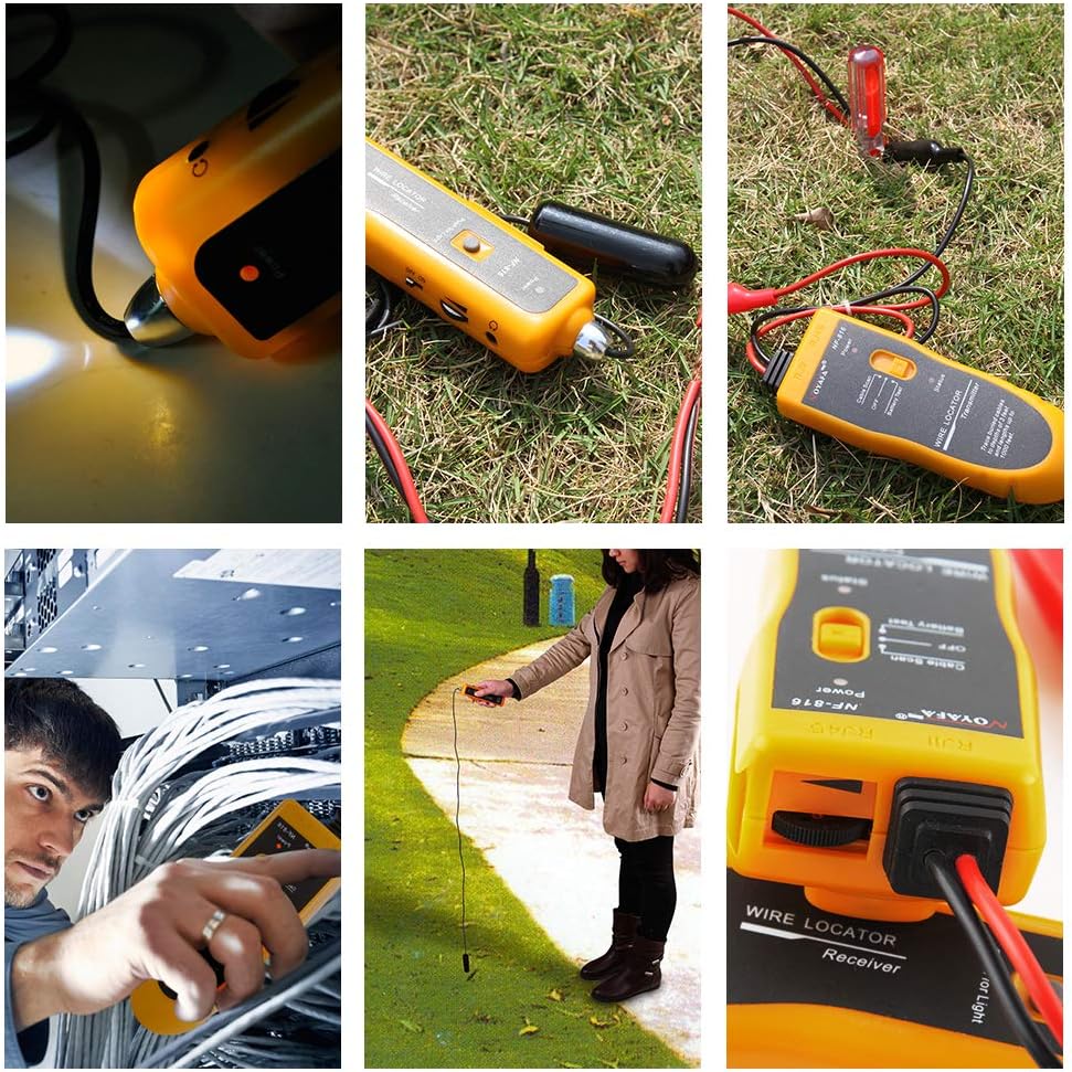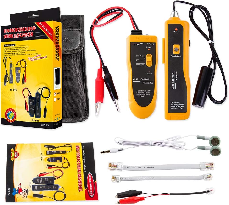 This device is mainly designed to allow users to track cables in the underground or in-side wall. At no time should this device be used on utility mains powered devices or cabling connected to the utility mains. If no Doubt do not use this device and call in a suitably qualified electrical contractor. NF-816 Transmitter specification. Tone frequency: 200kHz The Max length distance: 1000 feet The Max depth distance: 2 feet The Max. working current: Less than 70mA Max. signal voltage: 15Vp-p Signal display: Tone Max. signal voltage: 15Vp-p Battery type: DC9. 0Vx 1pc Dimensions (LxWxD): 49 x 135 x 33mm NF-816 Receiver specification Frequency: 200kHz The Max. working current: Less than 70mA Earphone jack: 1 Battery type: DC9. 0Vx 1pc Dimensions (LxWxD): 43 x 168 x 27mm