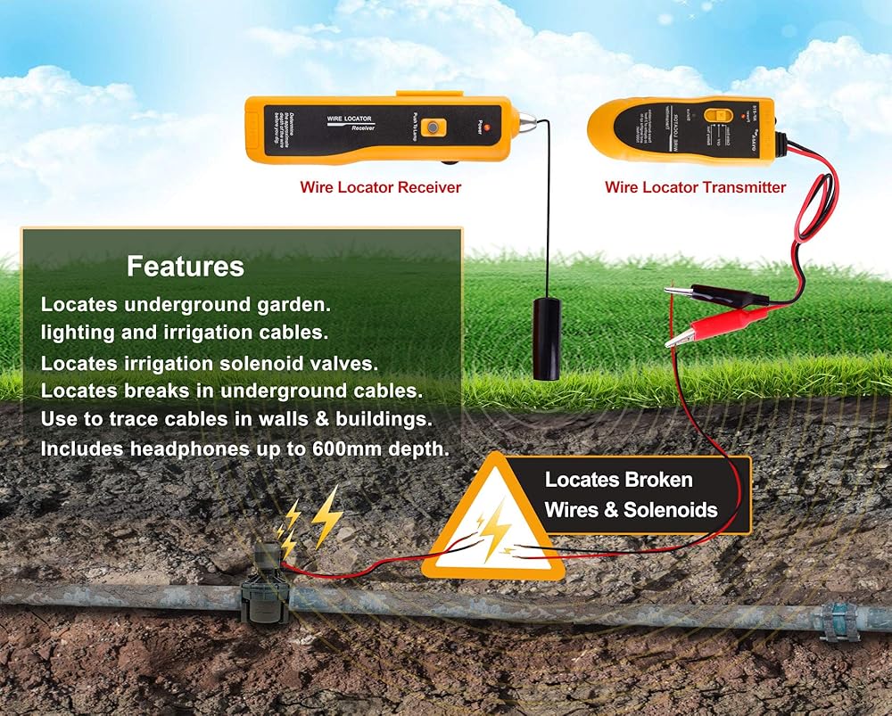 Tracking underground, buried wires and other hidden-wires, BUT NOT FOR sprinkle or irrigation valves