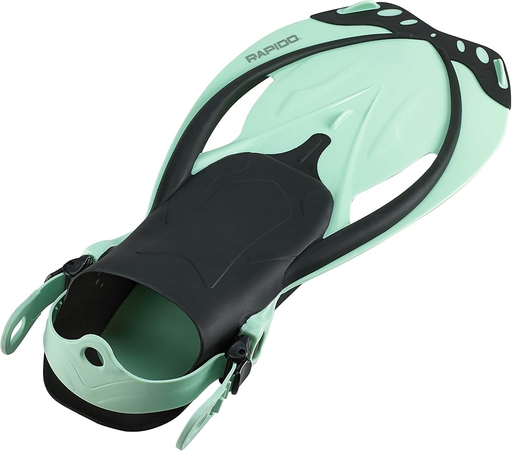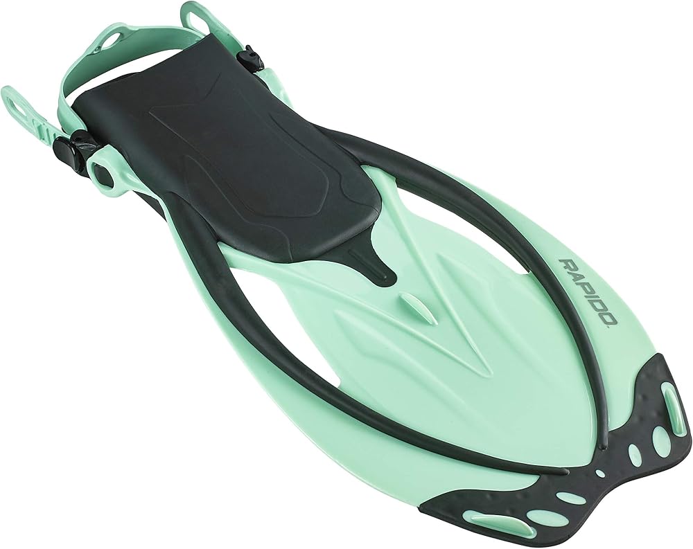 Enjoy a new snorkeling experience with the Rapido Boutique Collection Marine Adjustable Mask Fin Snorkel Set. the Marine fin is designed as a snorkeling fin that can be used with bare feet or beach socks. This vented fin has quick and easy adjustable heel straps equipped with both a large heel and strap end finger loops for easy donning, doffing and strap adjustment. The composite fin blade with its soft thermoplastic rubber heel strap. The Rapido Otimo Duo Mask can be used in the most demanding underwater descents and recreational use. Soft silicone materials create a tight seal. Exceptional visibility and low internal volume are key attributes that will make this your go to mask on your next adventure. Offering innovative new technology combined with superior design, build quality, materials and frame construction. Freedom model masks feature a dimpled skirt surface with varied silicone thicknesses and stability ridges in addition to a proprietary low friction double feathered edge skirt surface on the fitting line. Includes the Rapido Senhora Performance Dry Snorkel. Featuring a float mechanism that prevents entry of water when submerged. Generous bore contoured tube for ample airflow. Lower purge valve enables instant clearing when needed. Snorkel keeper attaches snorkel to a mask strap and features a Quick Release button.
