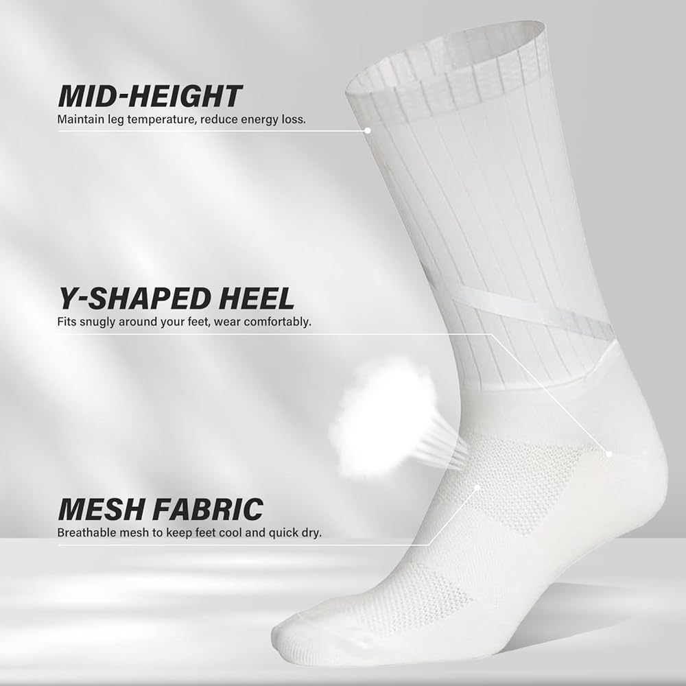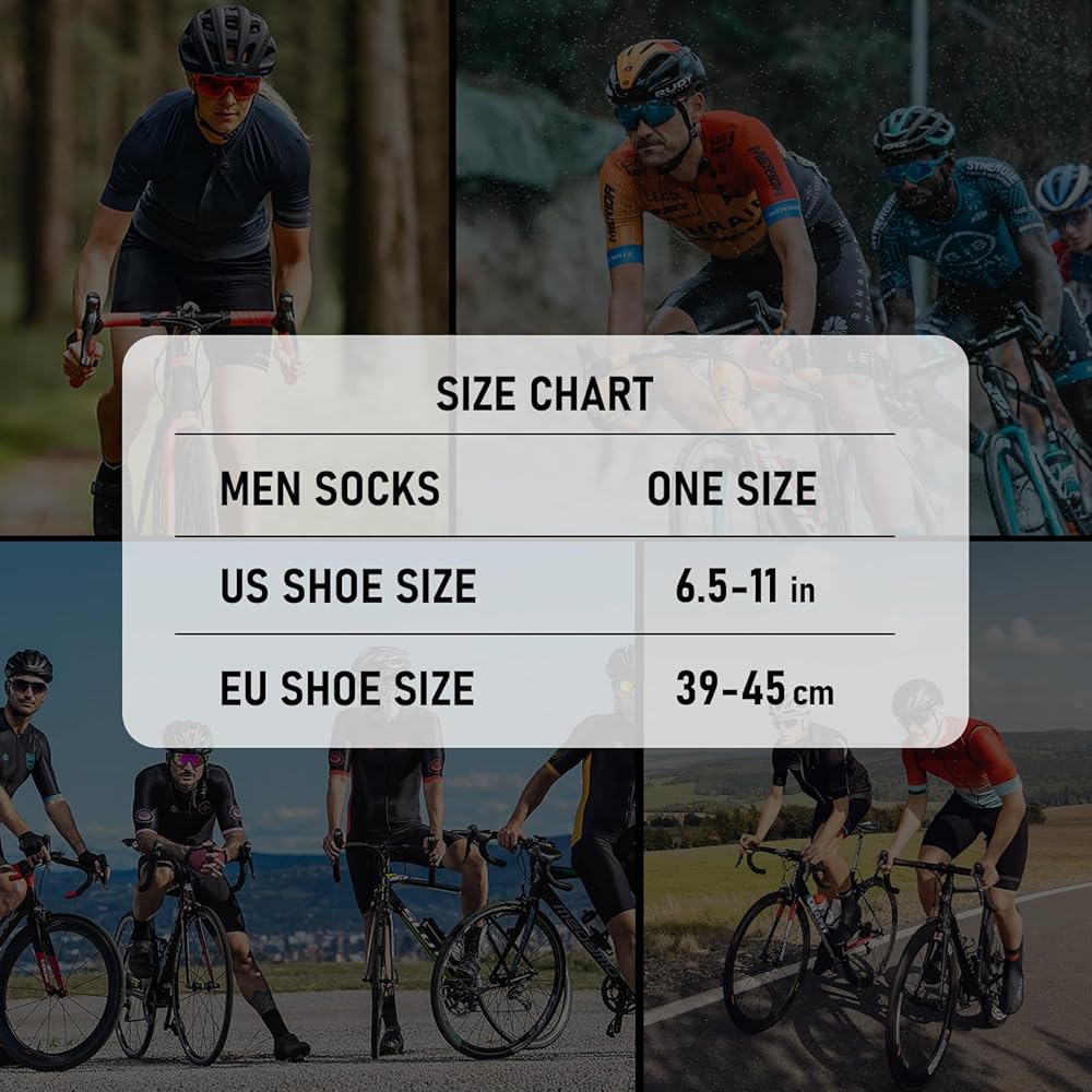 Mens cycling socks are made of skin-friendly material. Sock Leg with sturdy stretch fabric, durable and not easy to deform. Sock Foot is made of 95% nylon and 5% spandex, moisture wicking fabric, soft and comfortable. Good breathability keeps your feet dry.