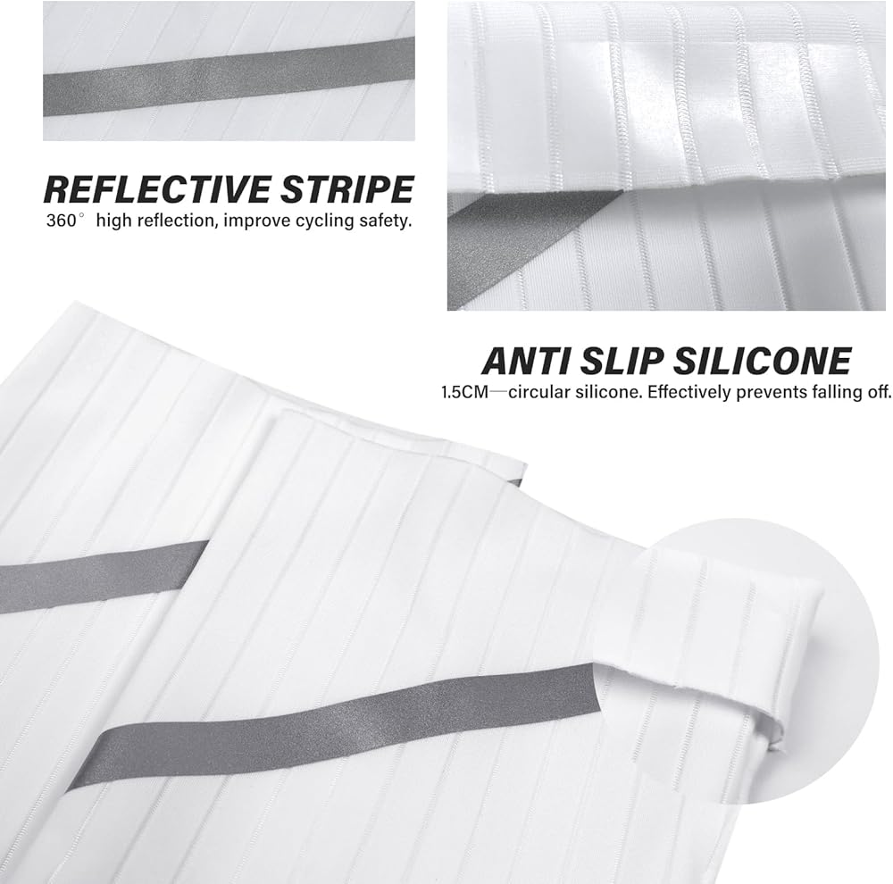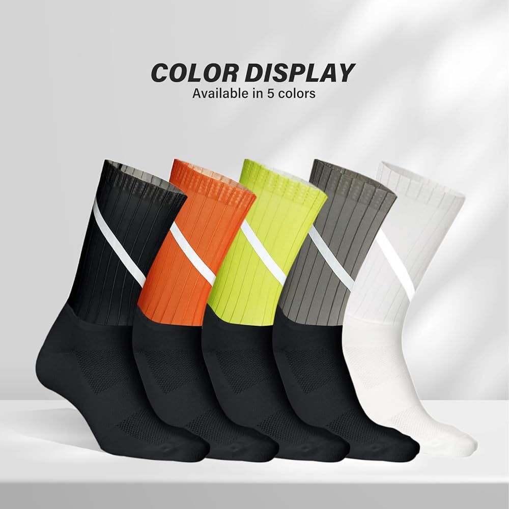 Aero socks for men with detailed design. 1.5cm wide non-slip silicone strips at the sock cuff, keeps the silicone bike socks from falling off, under high intensive exercise. 360 degree high reflective strip on the mtb socks leg, improve cycling safety.