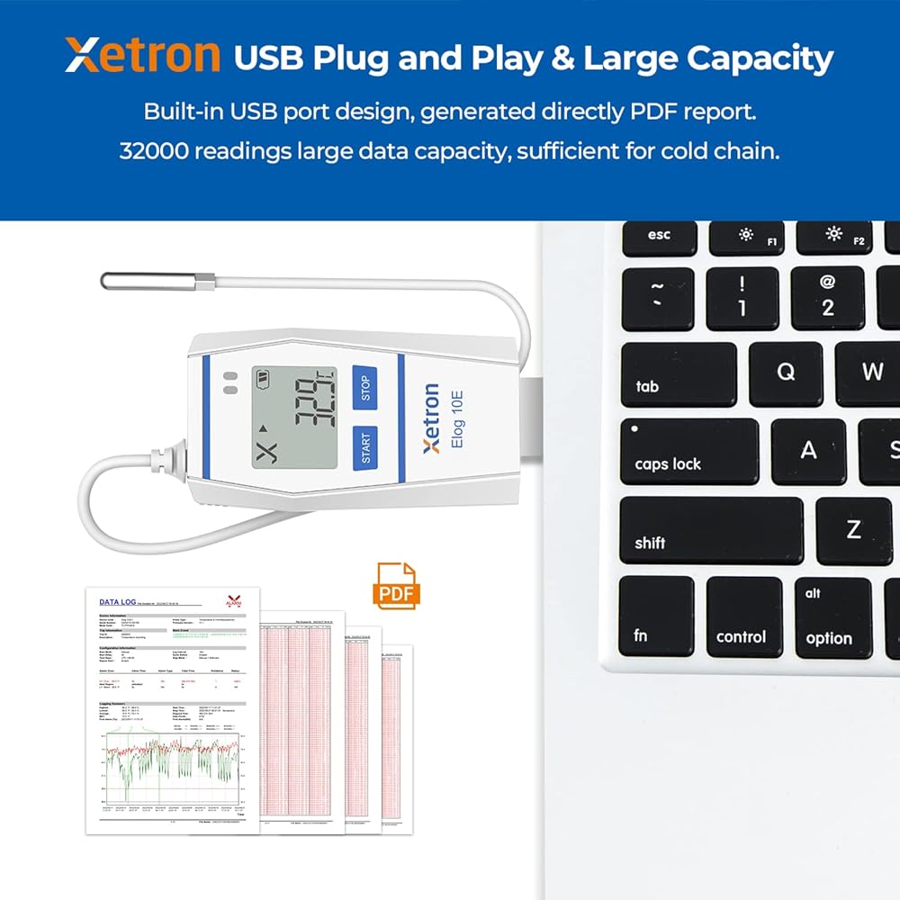 【Reusable + Waterproof Data Logger】 Our waterproof data logger is reusable and has an IP67 waterproof level, making it suitable for use in multiple scenarios such as refrigerators, refrigerated containers, medical cabinets, and more. You can export data without any additional software, and when you have too much data, simply log in to our Xetron software to back it up and clear the data to use it again. Keep your data safe and secure with our reliable data logger!