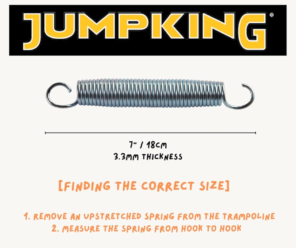 JumpKing spring set includes twenty 7 inch springs. JumpKing springs are constructed with high quality galvanized steel. Please measure spring from hook end to hook end when not on the trampoline for accurate measurement when ordering.