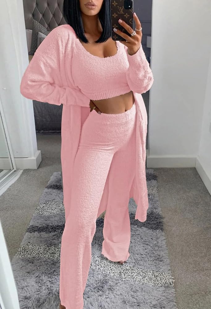 • Solid fuzzy 3 piece loungwear for women, soft, warm and fashion