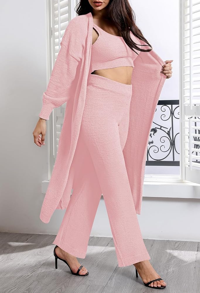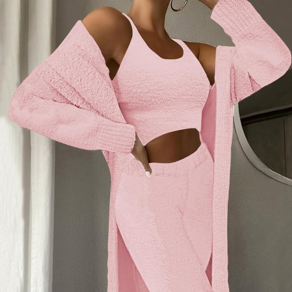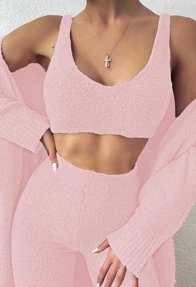 Women's Fuzzy 3 Piece Sweatsuit Open Front Cardigan Crop Tops Leggings Lounge Sets Sweatsuit Crystal Rose L