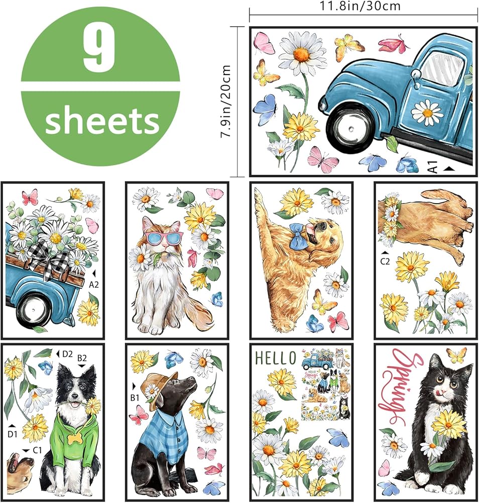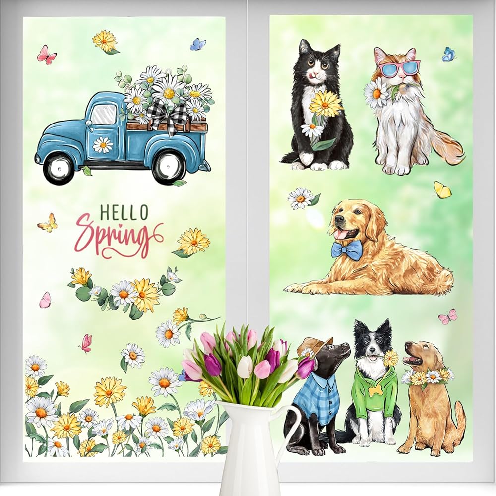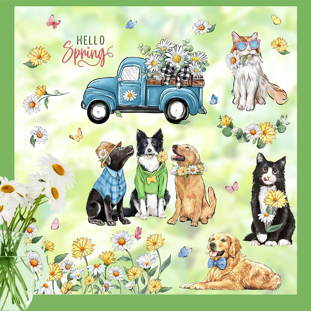 Yovkky Hello Spring Dog Cat Window Clings 9 Sheets, Pet Golden Retriever Puppy Kitty Daisy Flower Blue Truck Farmhouse Stickers Decals Decor, Floral Eucalyptus Butterfly Home Kitchen Decorations