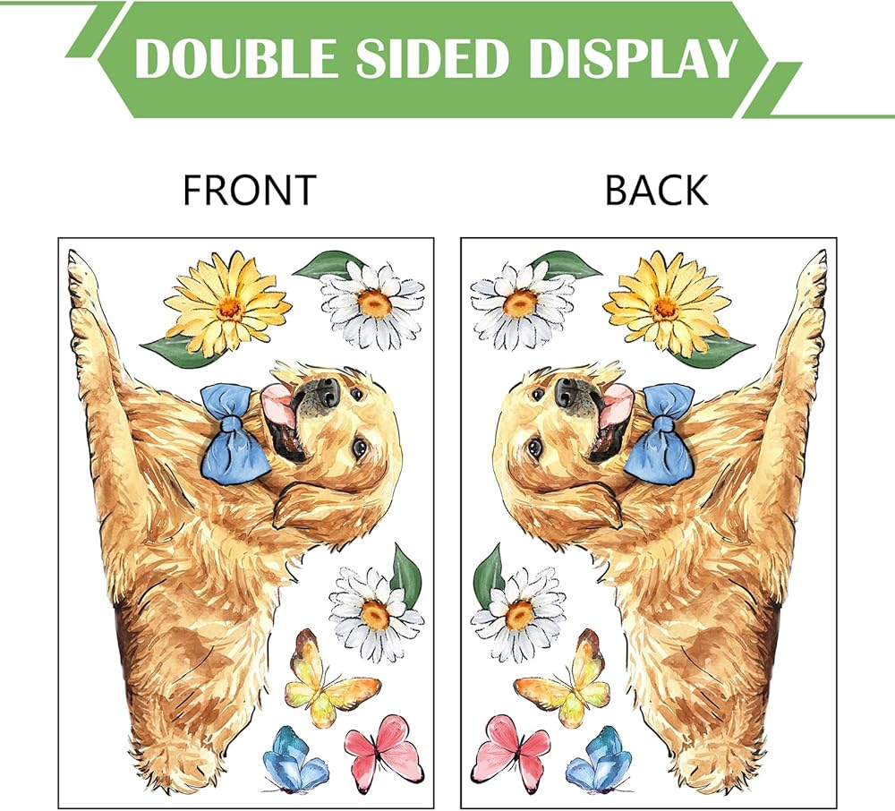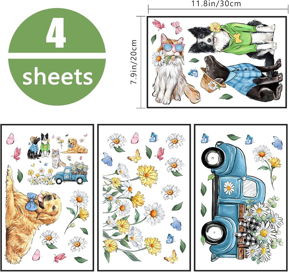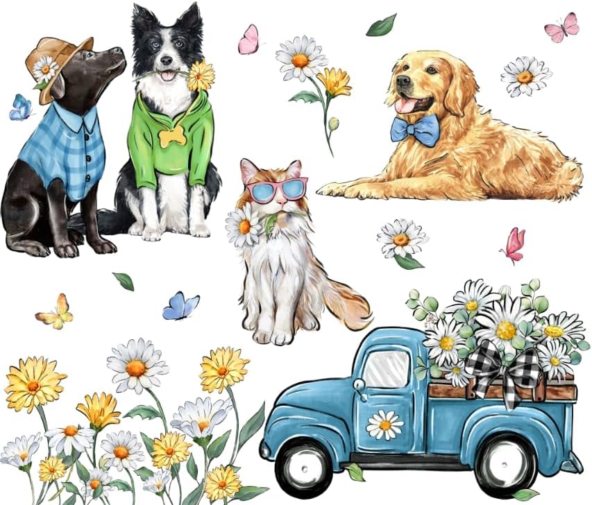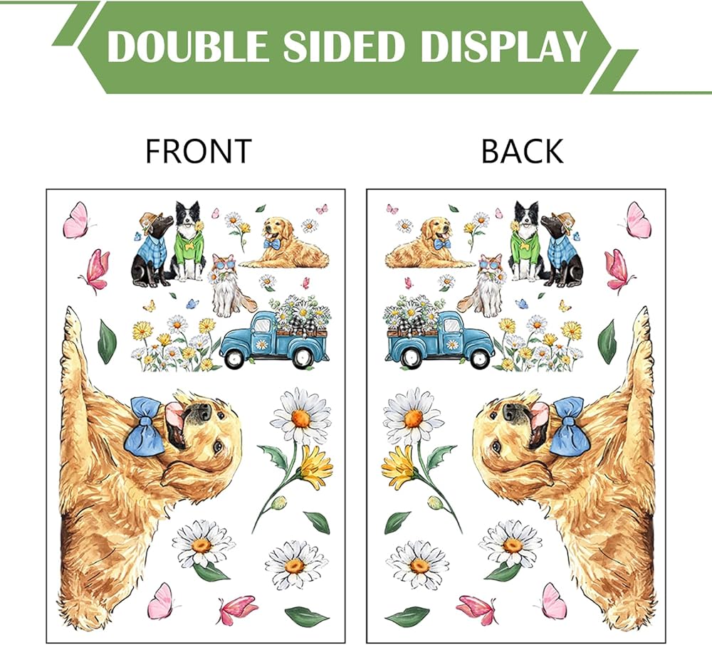 Yovkky Hello Spring Dog Cat Window Clings 9 Sheets, Pet Golden Retriever Puppy Kitty Daisy Flower Blue Truck Farmhouse Stickers Decals Decor, Floral Eucalyptus Butterfly Home Kitchen Decorations
