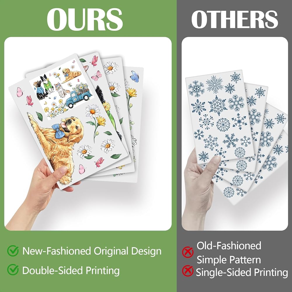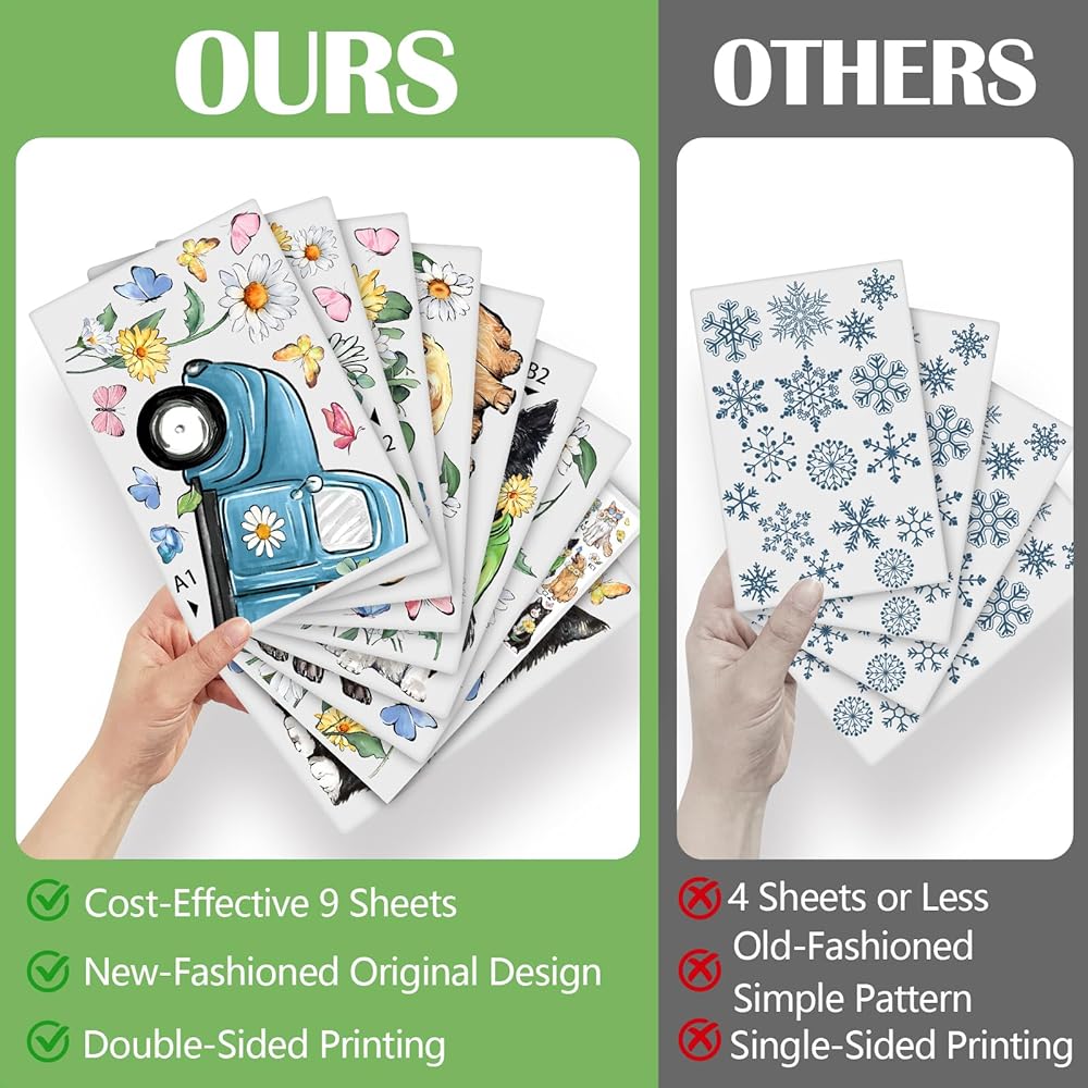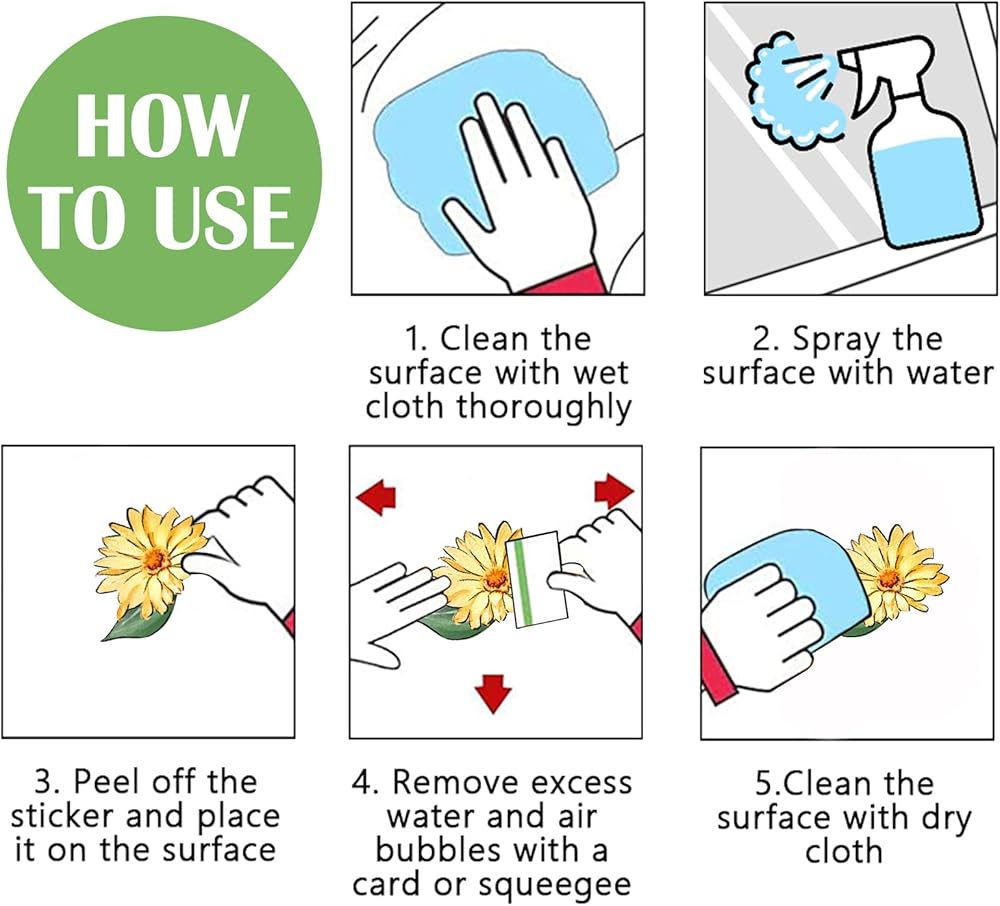 No Adhesive Home Decor: These spring and summer window decors are thin static clings, which do not require additional glue or tape, and can be easily attached to a smooth and dry surface. Just remove the window sticker and paste it on the surface of cars, trucks, glass, mirrors, windows, glass vandal-proof doors and bathroom surfaces; and use a card to squeeze out air bubbles from top to bottom. It is easy to attach to your window and remove without leaving sticky residue