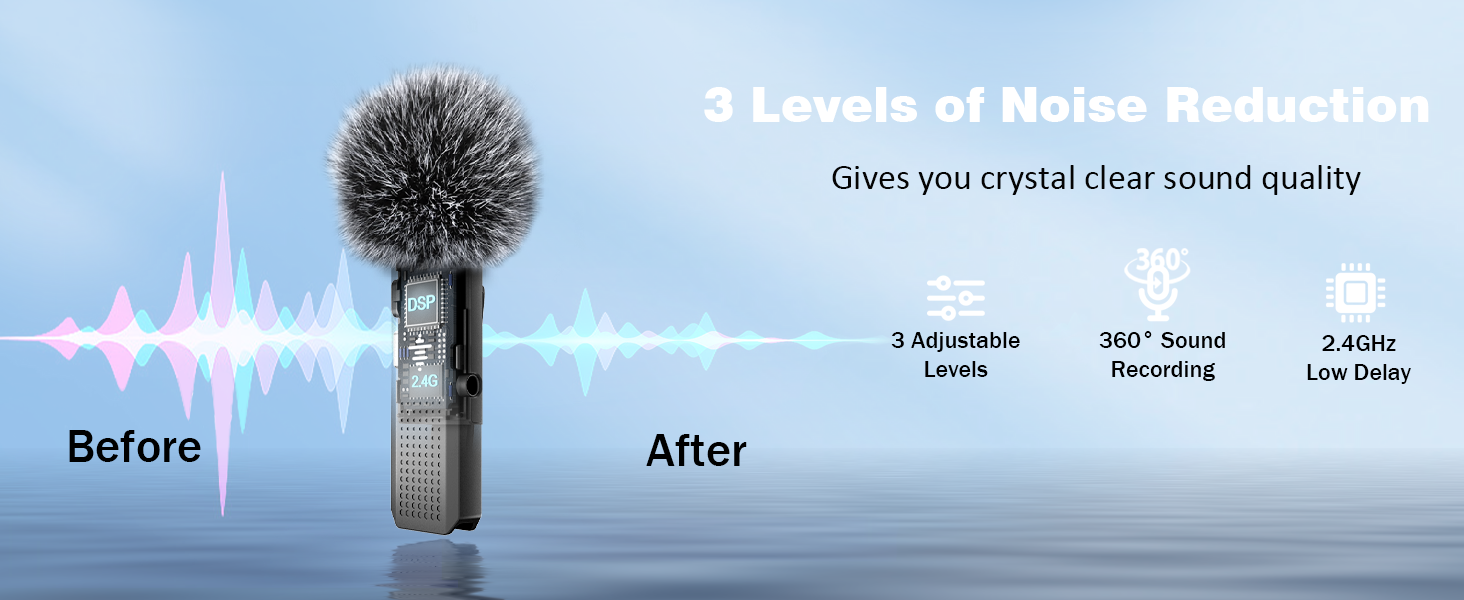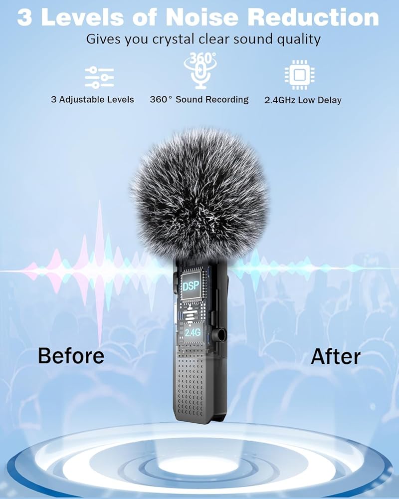 【3 Levels Noise Reduction, Clear Sound Quality】: Thanks to the professional-grade 2.4G intelligent noise reduction chip, HEYOWOCS wireless microphones has a market-leading "3 levels noise reduction function", compared with other similar products, in the noisy environment can more effectively recognize the human voice and make clear recordings. The included 2 furry windshields with the noise reduction module can accurately filter all kinds of noise such as wind noise, and the anti-interference ability is further enhanced, which makes it to be content creator essentials.