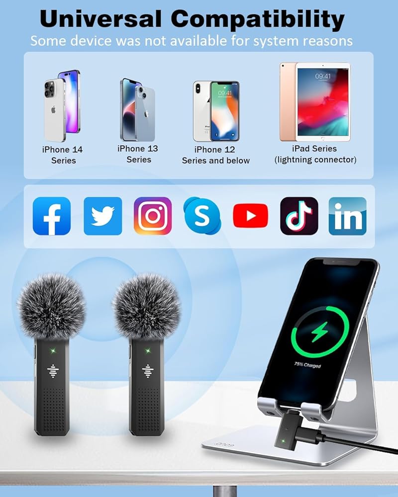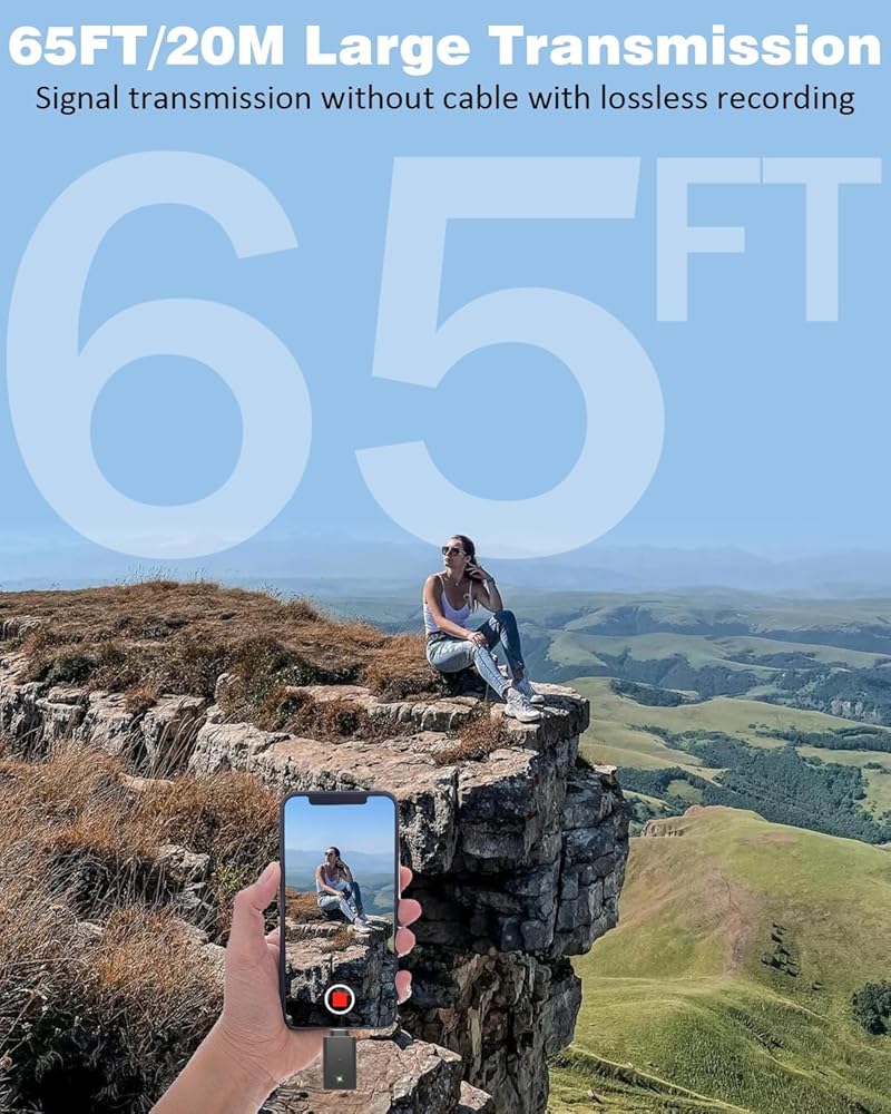 【Stable Transmission, Long Lasting Life】: The microphone for iphone 15 achieves stable transmission within 65 feet in an obstacle-free environment, automatic real-time synchronization, sound and picture synchronization without delay. Portable microphone built-in 60mAh rechargeable battery, each microphone can work for 6 hours with 1 hour charge. The microphone receiver is powered by your device, the USB-C port on the side can charge your device while using it, no more low battery anxiety.