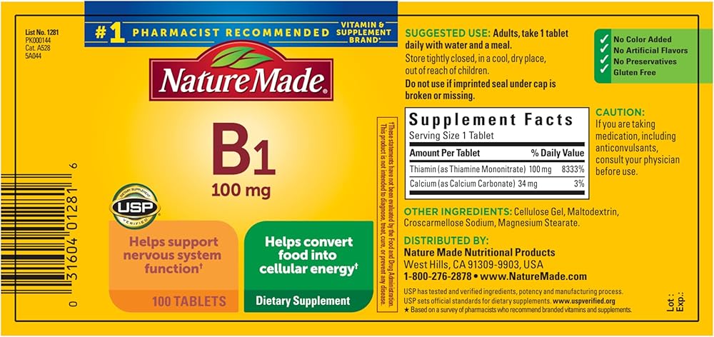 Nature Made Vitamin B-1 is recommended as part of a daily regimen for women's health, stress, heart strength, mood, energy, and fitness. Vitamin B-1, or thiamine, along with other B vitamins, helps produce energy in the body, especially in the brain. Its principal use is to prevent deficiency (especially in diabetes, Crohns disease, multiple sclerosis, and other neurological diseases), and help maintain proper mental function, particularly in the elderly. Severe thiamine deficiency is relatively uncommon, except in alcoholics, where a syndrome called Wernicke-Korsakoff (a serious brain disorder) can result from the combination of alcohol intake and a thiamine deficiency. Mild deficiency usually results in fatigue and depression.