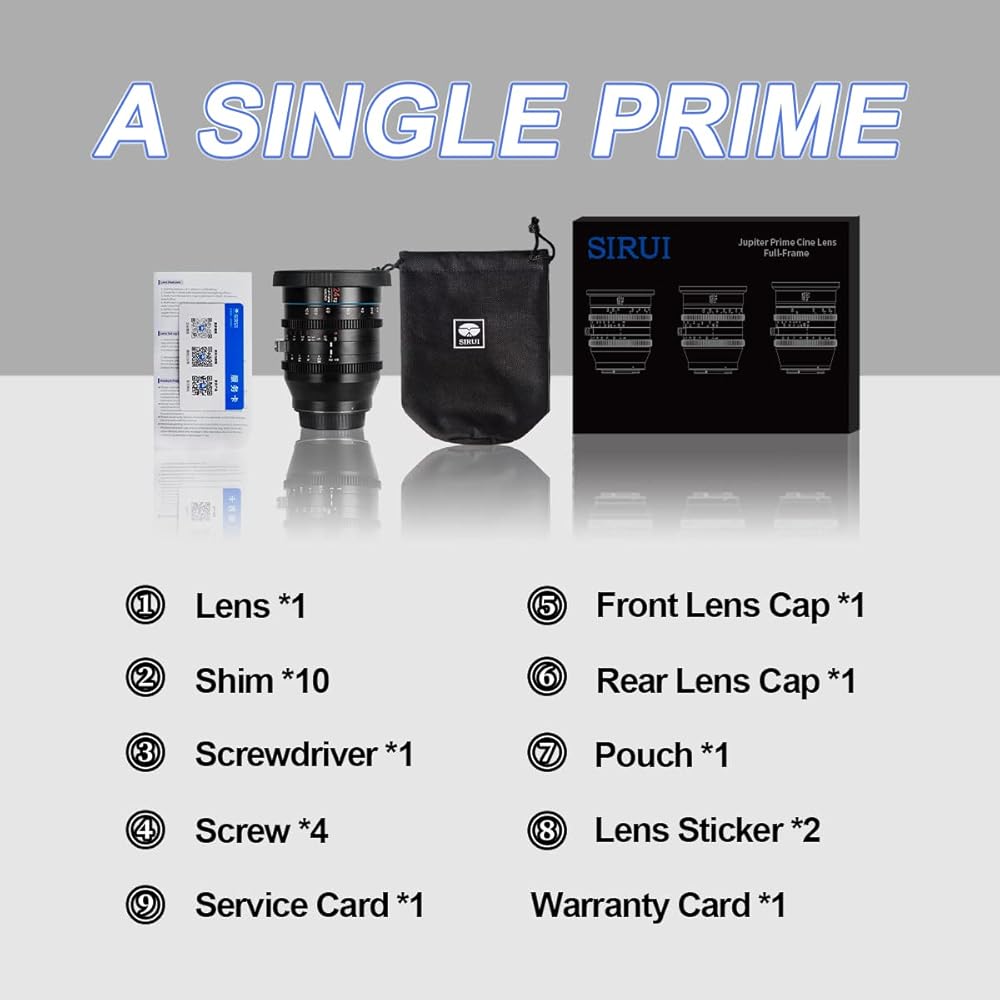 SIRUI 24mm Macro Full Frame Lens | Shootig Distance: 0.79ft(0.24m) - ∞ | Maximum Aperture: T2 | Minimum Aperture: T22 | Aperture Blade: 11 | Fliter Spec: M92X0.75 | Max. Diameter: 95mm | Diameter of the Focus Ring: 88mm | Diameter of the Aperture Gear Ring: 88mm | Gear Pitch: m=0.8 | Focus Method: Mannual Focus | Mount: EF Mount | Weight: 1.251KG/2.7lbs | Length: 111.7mm/4.40inches | Rotation Angle of Focus Ring: 202.4°| Structure: 13 Elements in 11 Groups