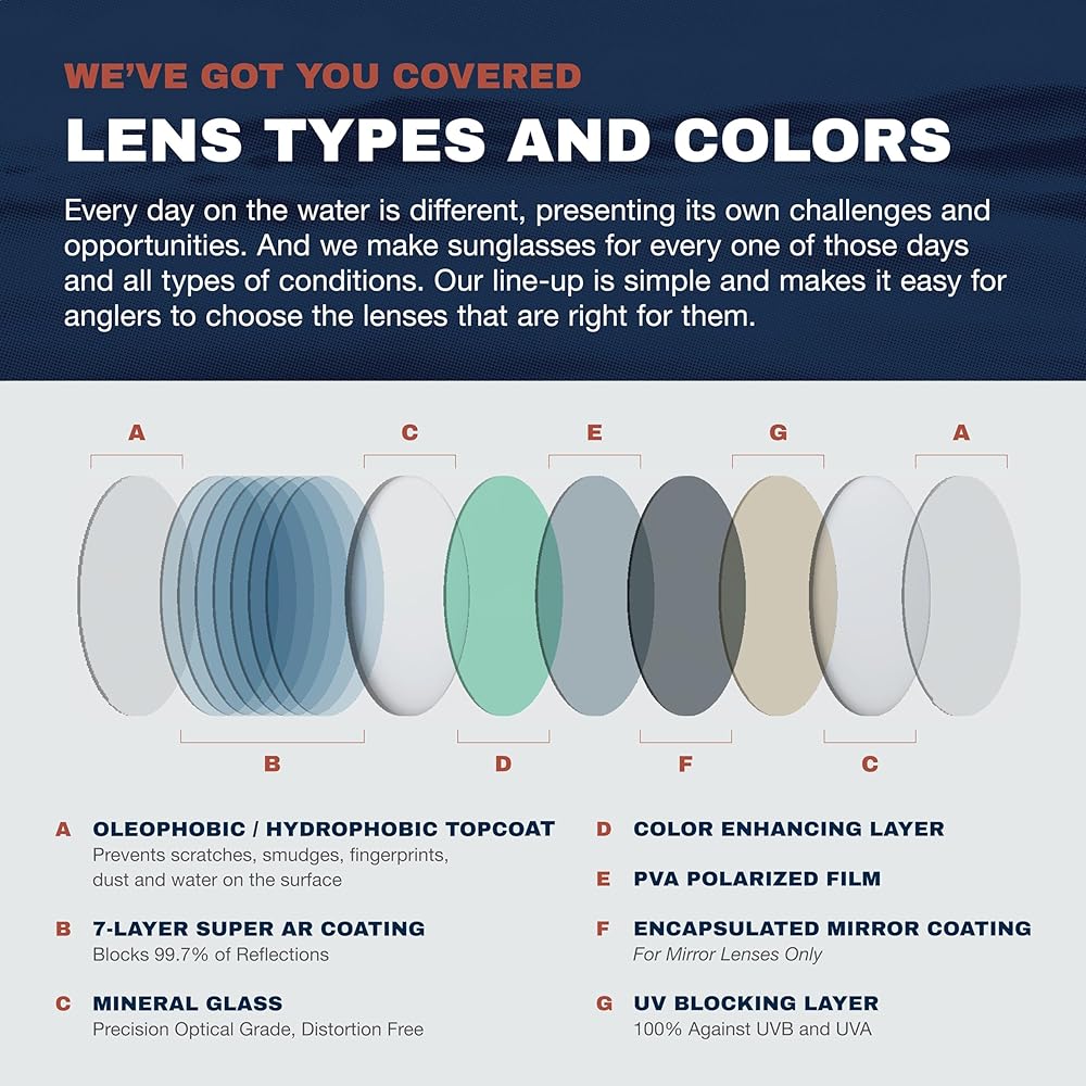 LATERAL LINE LENS TECHNOLOGY: Our 7-layer lenses are engineered to provide the ultimate in performance in a durable package – enhancing your sight without distorting your vision and making it easier to process what's happening beneath the water.