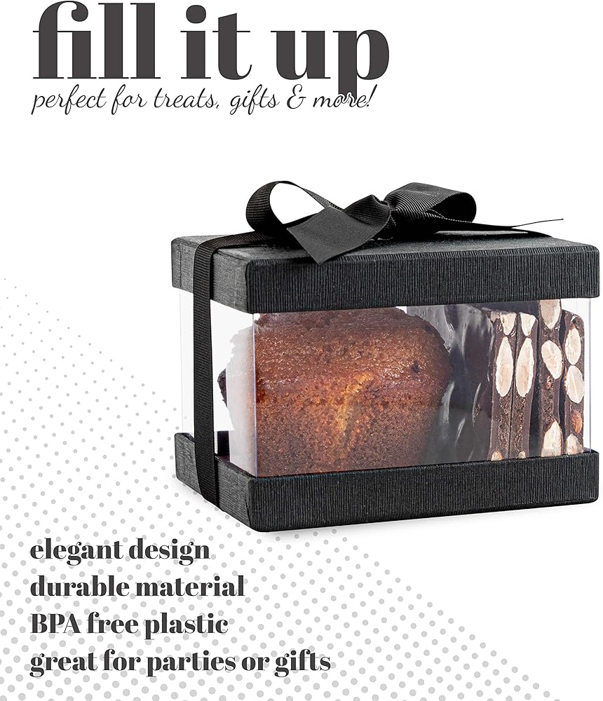 TRANSPARENT GIFT BOX: Unique and attractive way to pack your gift for your loved ones by displaying whatâs inside, improving products attractiveness by using these clear gift boxes; no wrapping needed, ditch the standard gift wrapping paper PREMIUM QUALITY: Transparent Gift Boxes are quite easy and convenient as it comes flat and made out of a finest quality paper material, DIY ready solid box for arts & crafts and these are sturdy enough to hold a fair amount of weight GREAT FOR GIFTS: Perfect gift wrap solution for small gifts, such as tiny wedding favors, beauty products, cookies, brownies, snacks, muffins or small cakes in these boxes to give as gifts; each box will keep your delicacies safe and looking good PACKAGE INCLUDES: Set of 6 boxes have dimensions of 4â x 4â x 4â; these party favors candy boxes are also available in six different colors along with cardboard lid, base and matching ribbon, which is perfect and ready to gift your loves ones SATISFACTION GUARANTEED: We are confident you will love our clear gift boxes. You can be confident in buying it, as all Hammont products are made of best materials, at the most reasonable prices for our customers!