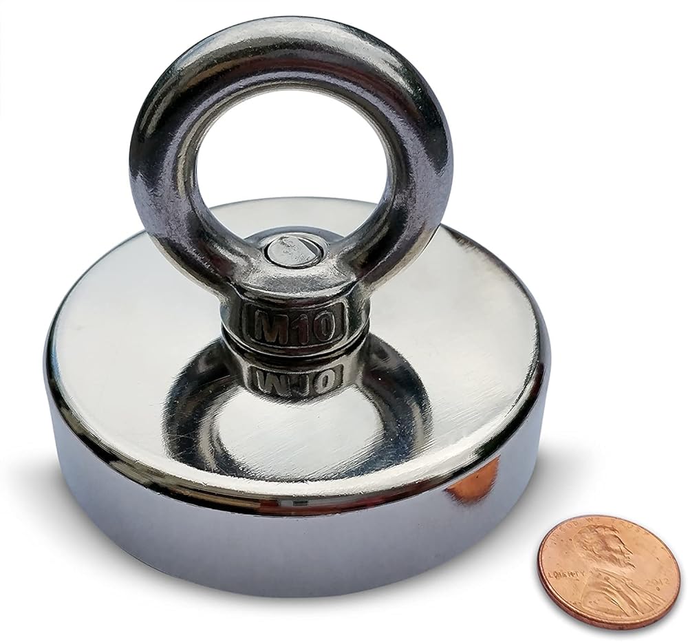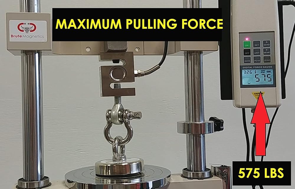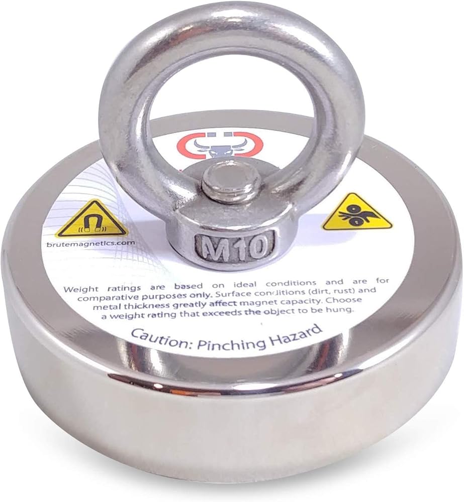 SINGLE-SIDED MAGNET has 575 pounds of exceptional pulling force and a 2.95" diameter. Included with the magnet is a eyebolt and threadlocker for securing the eyebolt. Brute magnets are ideal for retrieving or “fishing” metal objects from lakes, rivers, and streams.