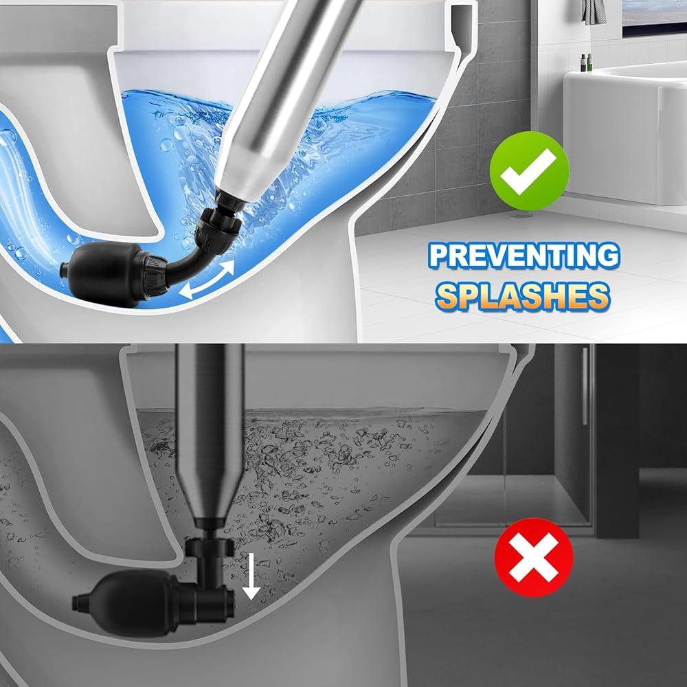 【Upgrade Plunger Blaster】The electric plunger for toilet is designed with a curved head, compared to the old 90-degree straight head, the flexible head is easier to enter the flushing port with better sealing. It can be easily unclogged with a single button press, avoid the problem of sewage splatter.