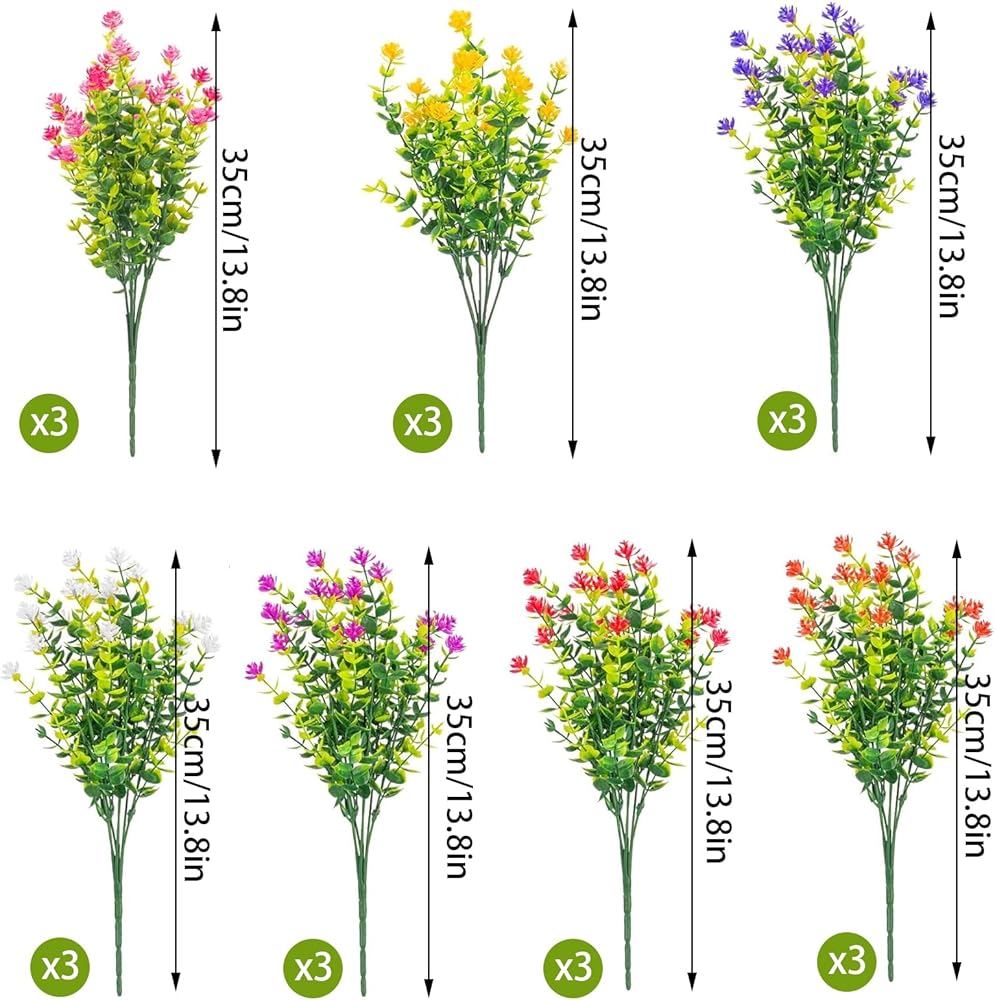• Plastic Flowers for Outdoors Size: Approximately 13.8" tall x 7.8" wide, each bouquet has 7 flexible stems with bushy leaves and 21 flowers that are colorful and will not fade, making them very realistic.