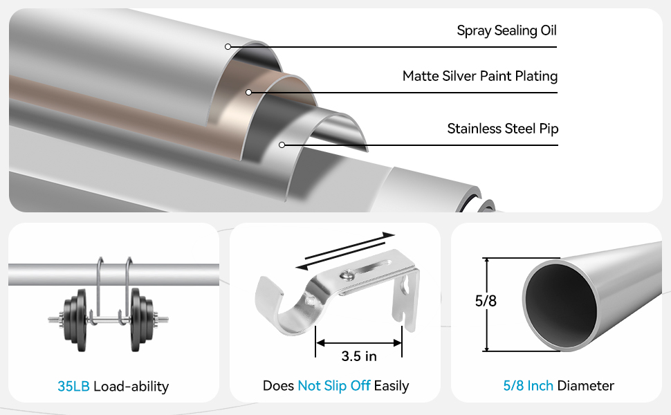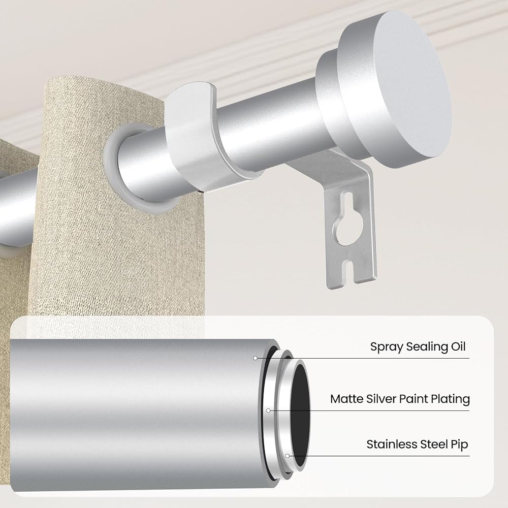 【Rust-Proof & Wear-Resistant】This matte silver curtain rod features a functional and decorative modern classic tail cap design. The perfect coating process creates a matte finish that has been tested many times to make it resistant to rust and wear, complementing any type of curtain.