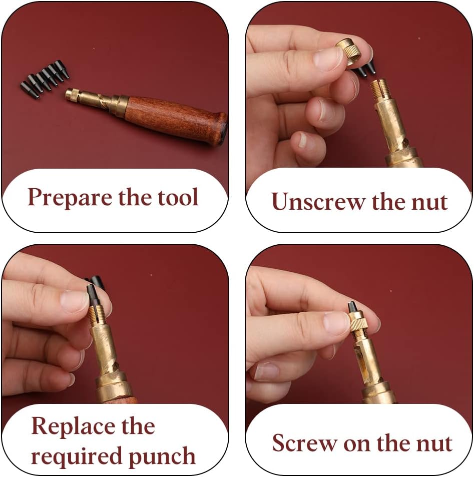 Easy to Use: The punch can be easily removed and replaced at will. Fix the leather material, the punch is 90 degrees perpendicular to the leather surface, and press the handle at the required position to punch a hole.