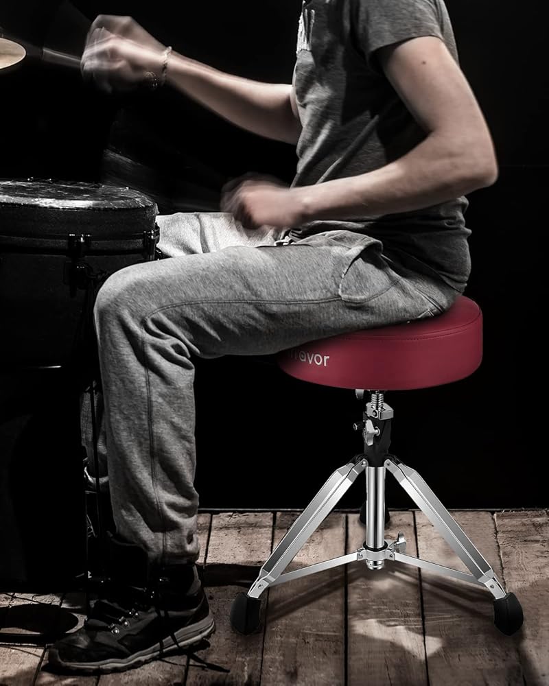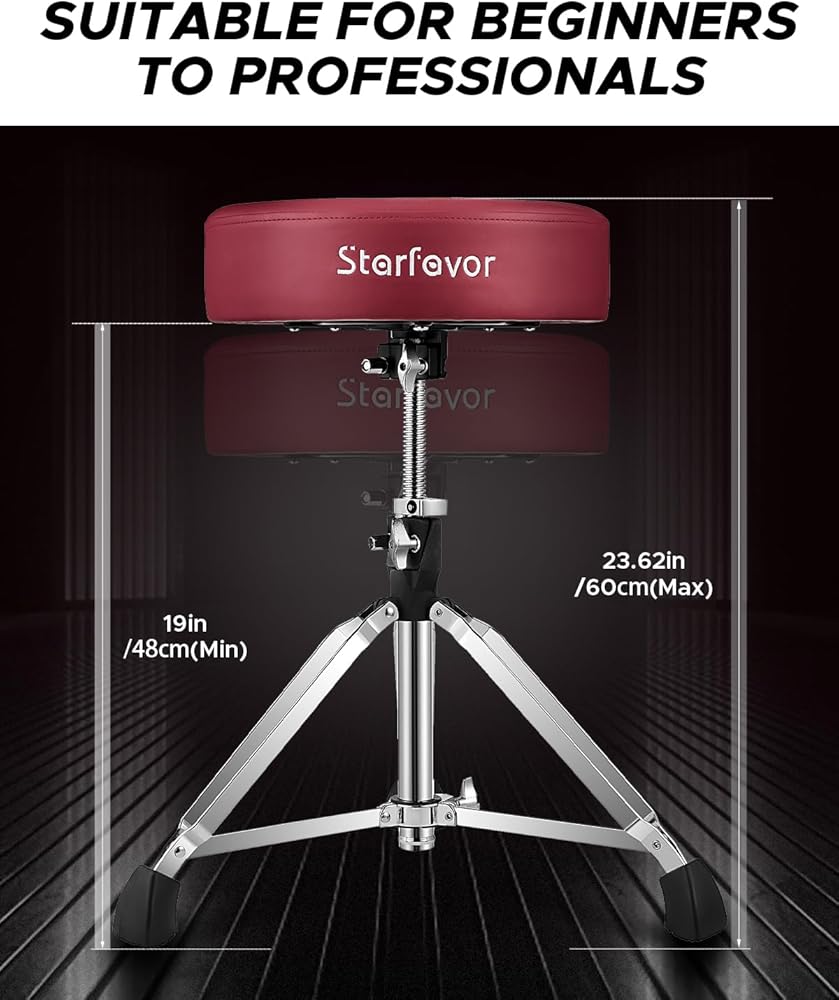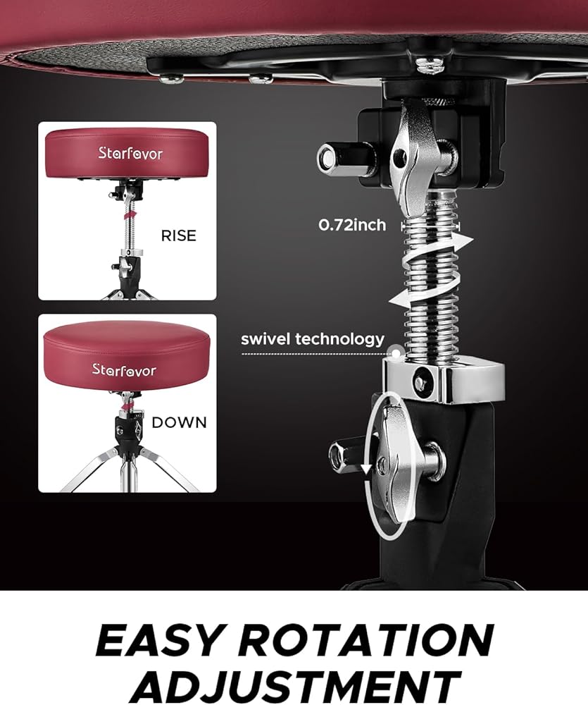 【ROTATE TO ADJUST】Swivel to adjust the drum throne any height you want from 19in to 23.62in. Convenient and reliable for daily practice or on-stage performance. The 0.9-inch thick solid swivel rod ensures durability and professional quality.