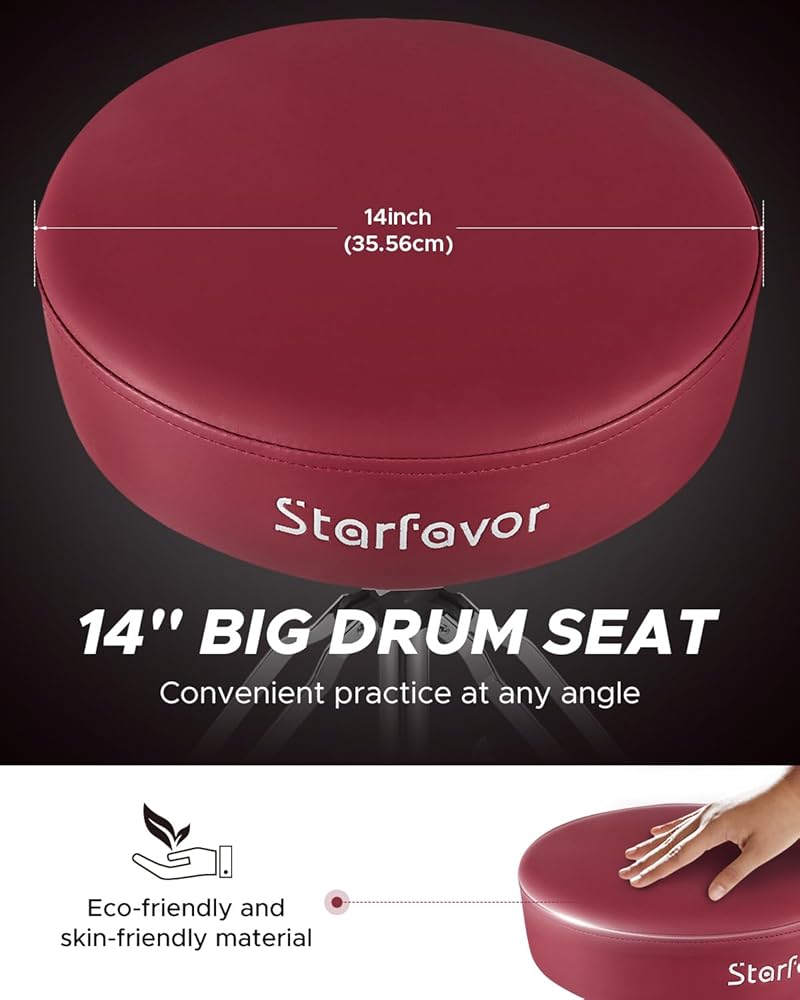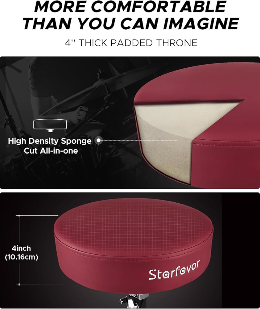 【THICK SEAT】High-density sponge is made of integral cotton, the 4'' thick padded drum seat provides maximum comfort for drummers. The drum throne is durable, breathing, and not easily deform.