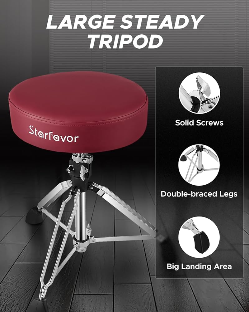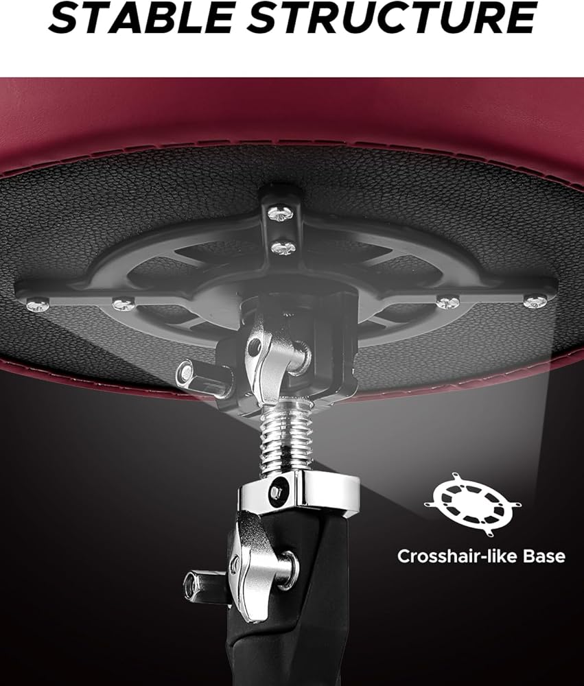 【SUPPORTIVE BASE STRUCTURE】The cross-collinear supporting drum seat base structure makes it a heavy-duty throne. Secured by 8 screws, the drum throne can withstand up to 350 pounds.