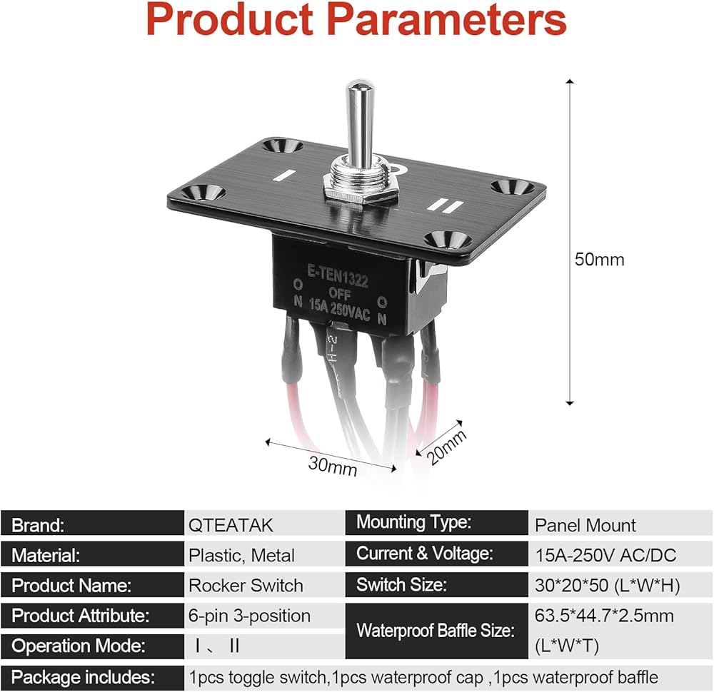 【Product parameters】: Brand: QTEATAK Material: Plastic, Metal Terminal: 4-pin Mounting Type: Panel Mount Current and Voltage: 15A-250V AC/DC Waterproof baffle size: 63.5mm *44.7mm *2.5mm (length*width*thickness) Package includes: 1pcs toggle switch,1pcs waterproof cap ,1pcs waterproof baffle