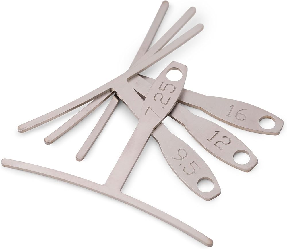 Each of these unique gauges has an accurately radiused arc on both the top and bottom surfaces, and is shaped to fit easily under the strings.