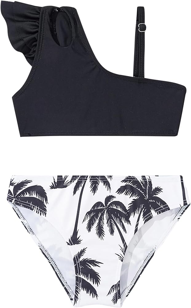 DESIGN:stylish one-shoulder sling top, coconut tree, flowers, feathers and other printed shorts swimsuit suit,the best gift for girls this summer!